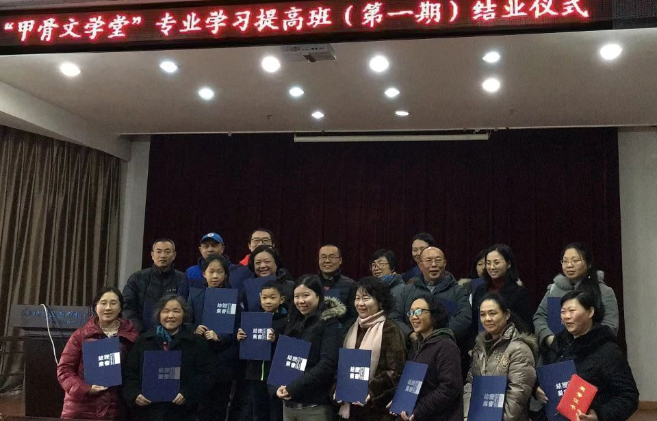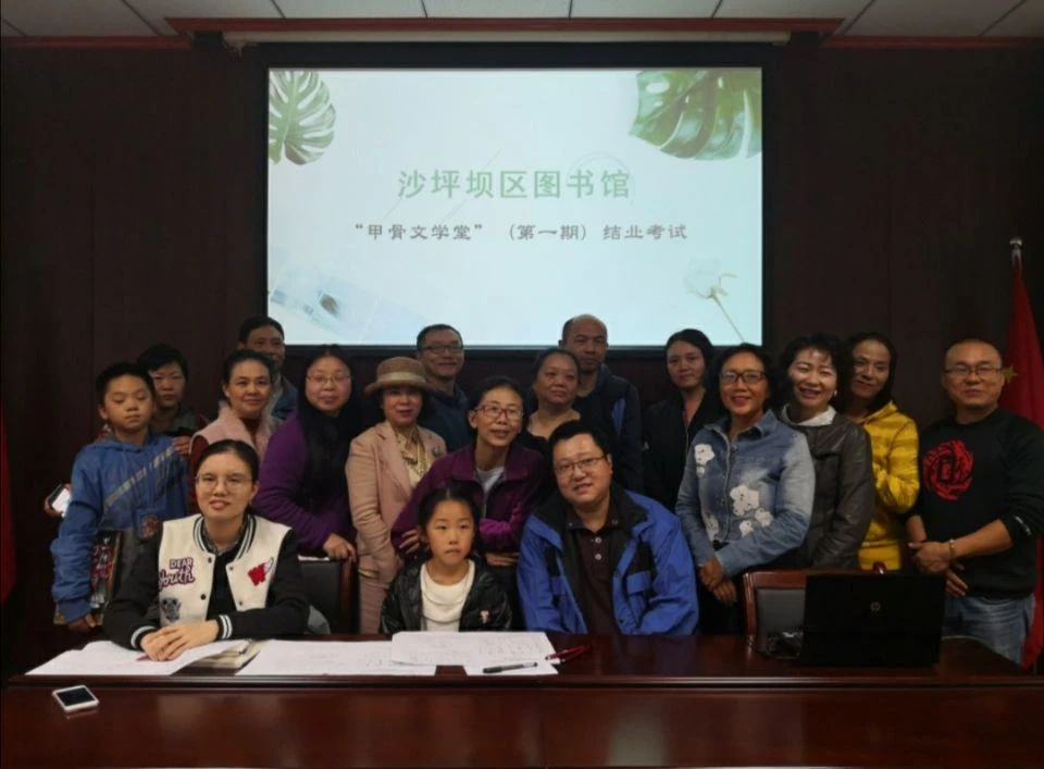 为了让甲骨文等古文字学走出象牙塔,喻遂生教授、邓飞教授、李发副教授、苏文英老师与我所甲骨文金文研究方向的研究生组成“甲骨文金文讲师团”, 坚持为重庆市民普及甲骨文等古文字知识。自2017年11月以来,前往沙区图书馆,除寒暑假外每月为重庆市民间“甲骨文字社”的学员授课。2019年10月,完成了为期两年的首期甲骨文学习课程。40余名学员参加了结业考试,其中29名学员成绩合格。