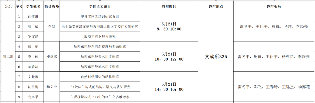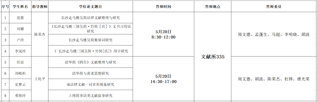 我所2023届硕士研究生学位论文答辩会将于2023年5月20日至5月21日举行,具体安排如下: