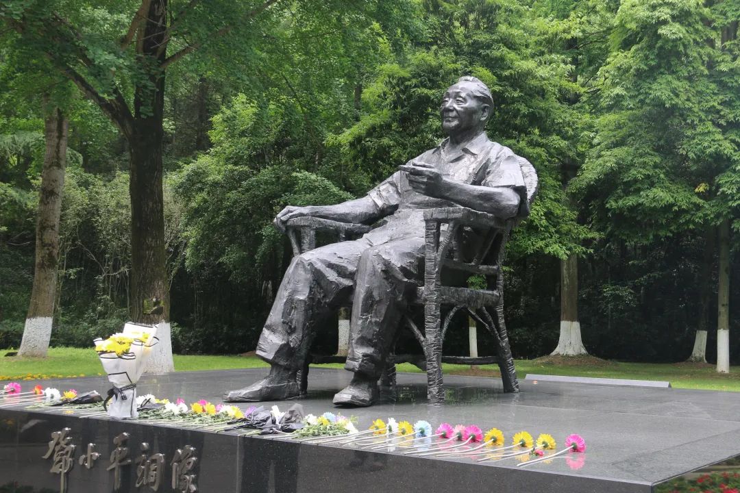 邓小平铜像广场有一尊邓小平先生的坐像,铜像高2.5米,重1.2吨,坐北朝南,基座由黑金沙花岗石制成,正前方镌刻着江泽民同志题写的“邓小平铜像”五个大字。这尊铸铜坐像面容温和,两颊瘦削,目光敏锐深邃。邓小平同志身穿短袖衬衫、军便裤、沿口布鞋,面带微笑地坐在椅子上,亲切地注视着家乡的山山水水。