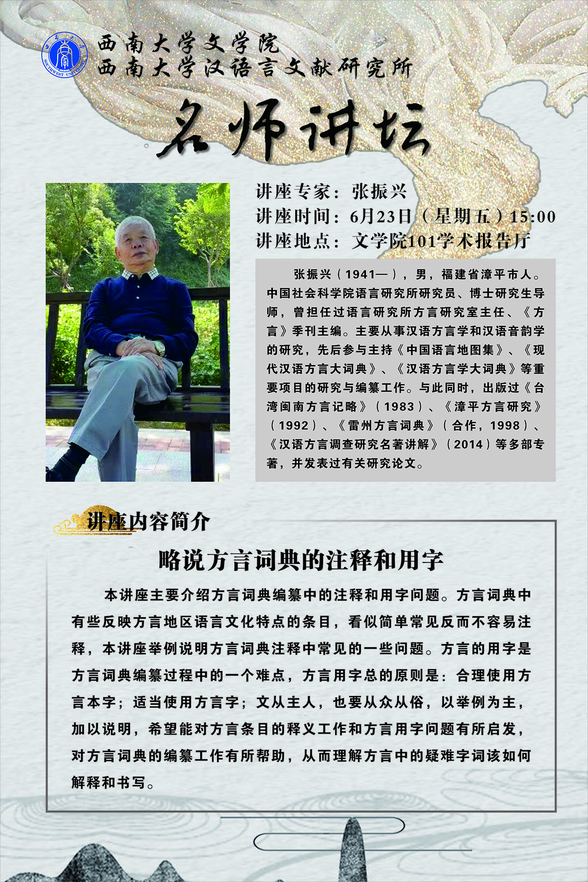 张振兴,中国社会科学院语言研究所研究员、博士研究生导师,曾担任过语言研究所方言研究室主任、《方言》季刊主编。主要从事汉语方言学和汉语音韵学的研究,先后参与主持《中国语言地图集》《现代汉语方言大词典》《汉语方言学大词典》等重要项目的研究与编纂工作。与此同时,出版过《台湾闽南方言记略》《漳平方言研究》《雷州方言词典》(合作)、《汉语方言调查研究名著讲解》等专著。