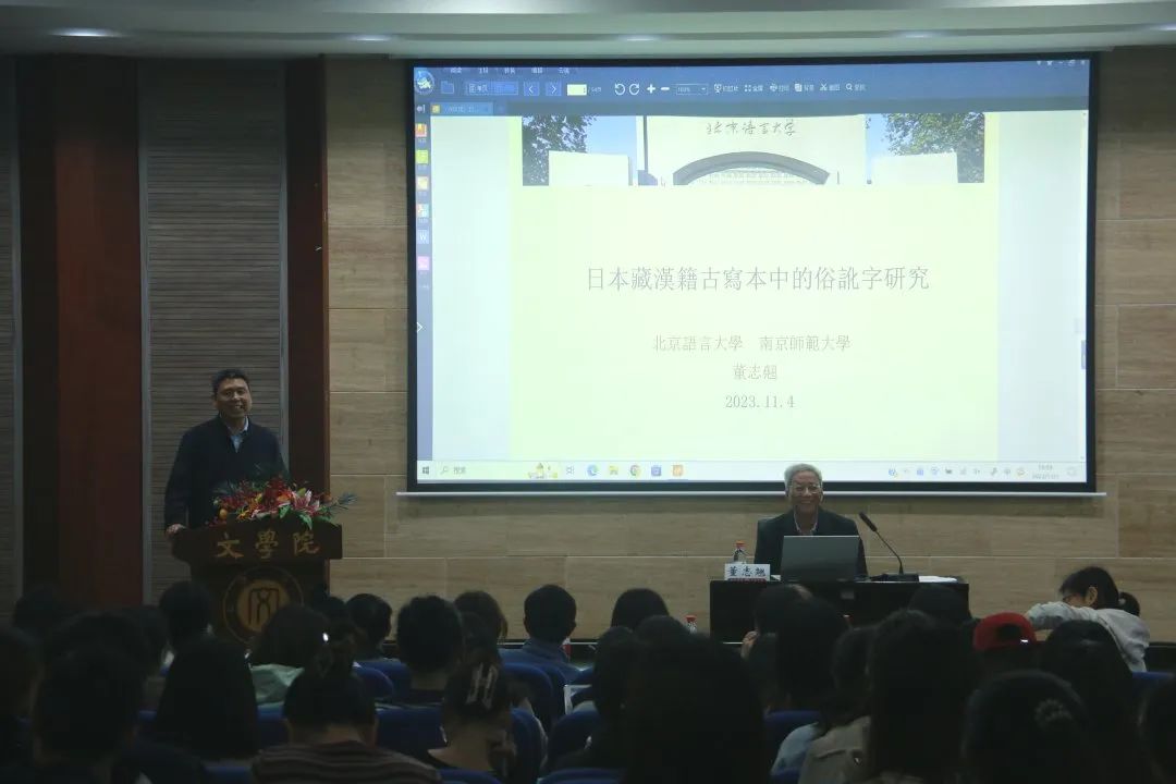 11月1日晚7点,由英国上市公司365主办的“学行堂名家讲座”在文学院101报告厅成功举行。北京语言大学特聘教授董志翘受邀做了题为“日本藏汉籍古写本中的俗讹字研究”的精彩讲座。文献所所长孟蓬生教授主持本场讲座,文献所及文学院师生到场聆听。