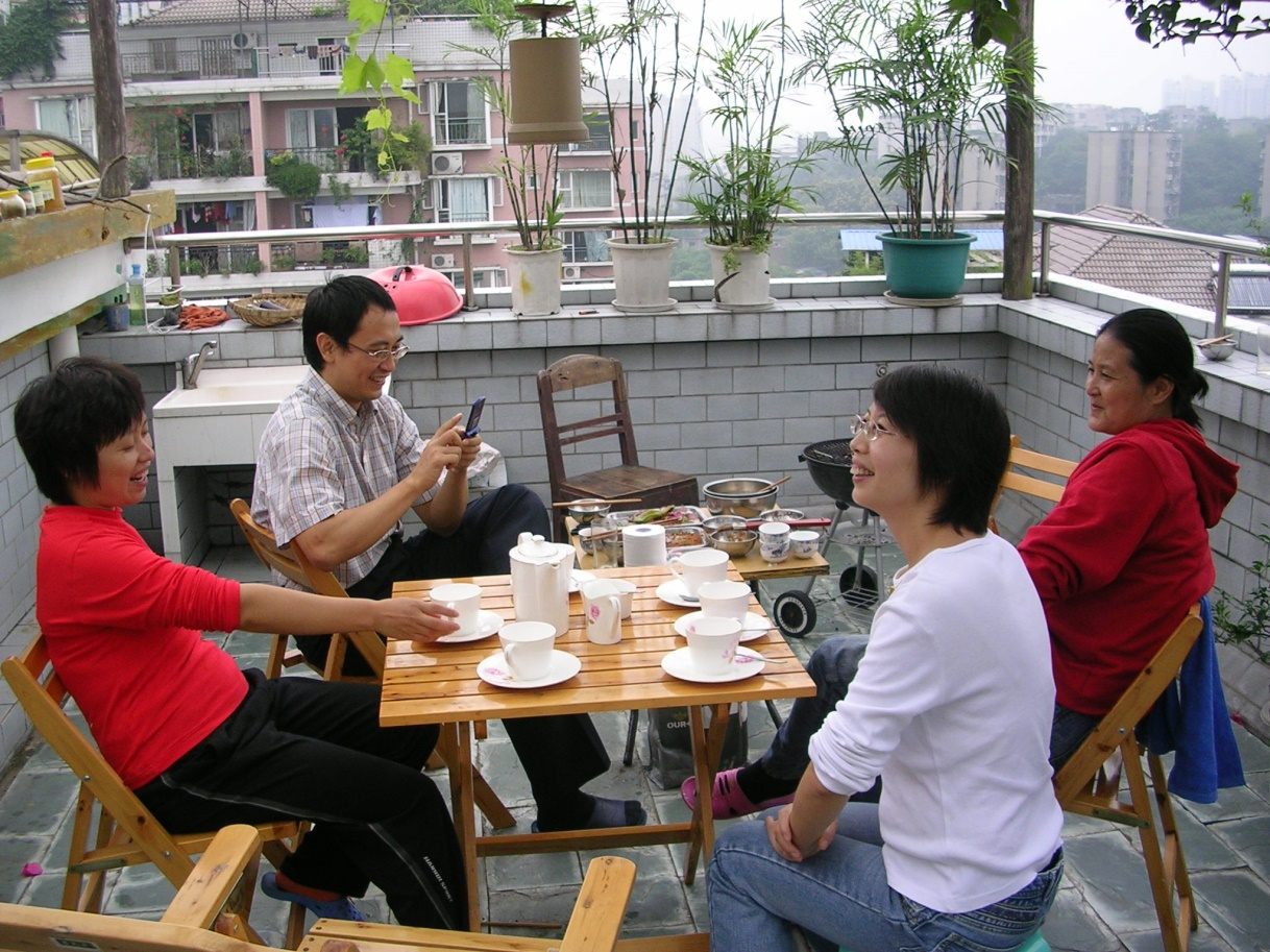 (在苏文英老师家楼顶花园。邓飞、苏文英、武晓丽、黄立凌)