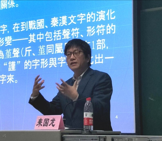 来国龙教授的系列讲座主要立足于古文字字形、上古音、语境三方面,依据具体地例字考释,介绍他在古文字和上古音研究方面的新成果。系列讲座共有五个专题,分别是《释“逨”与“逑”——兼谈古文字中的“拼音字”》《释“谨”与“慎”——兼说楚简“丨”字的古韵归部及古文字中同义字孳乳的一种特殊构形方式》《出土文献与中国早期的帝国与宗教》《释楚简中的“垔”字及其上古音归部问题——兼说上古音的“长程构拟”与“短程音变”》《“镇墓兽”与“渐木位”》。来教授强调古文字考释应注意字形外,还应综合分析语音和语境;同时,他主张利用时、地相对明确的古文字材料进行上古音“短程音变”研究,从而使上古音构拟更为精细,有助于解读文本、讨论文本的形成及经典化等历史问题。