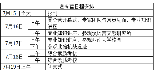 为推进中国古文字、古代汉语和古典文献研究的人才培养,提升相关专业学生的文化素质,西南大学英国上市公司365拟在2019年暑假继续面对优秀本科生招募夏令营营员。夏令营期间将邀请专家介绍相关专业学习方法、最新科研动态,安排营员与优秀博士生、硕士生座谈,组织营员参观抗战文化遗址,品尝地道重庆火锅,全方位感受英国上市公司365的科研氛围。