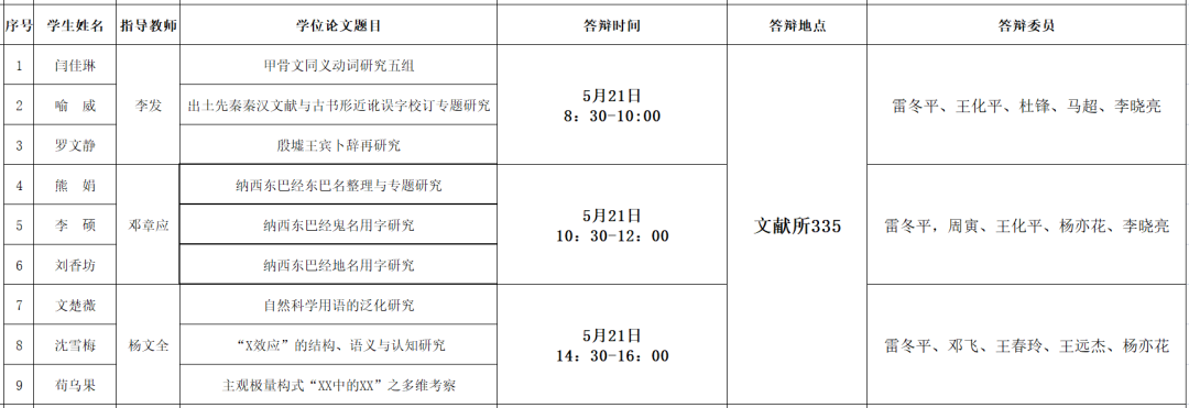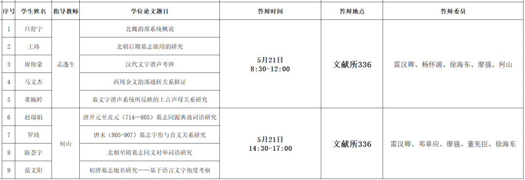 我所2023届硕士研究生学位论文答辩会将于2023年5月20日至5月21日举行,具体安排如下:
