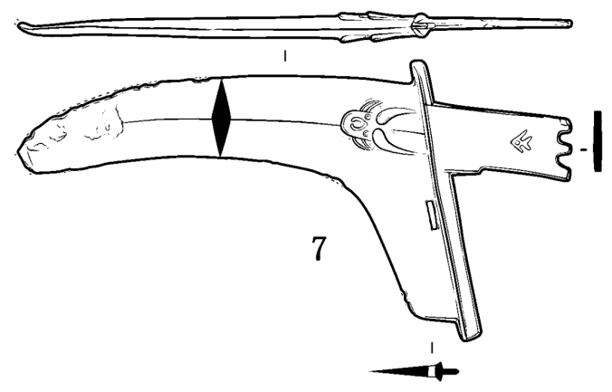 尺度重量:殘長23.2、援中寬3.4、厚0.8、闌長12、內長5.8、內尾寬2.6釐米。重325克。