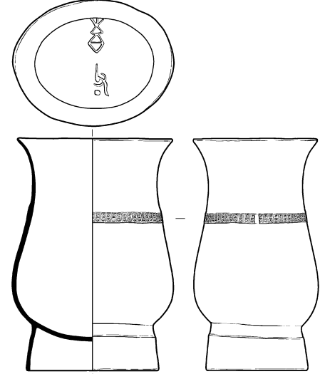 尺度重量:圈口徑8.4、短徑6.8、腹最大長徑8.8、最大短徑6.8、腹深10.6、圈足長徑7.2、短徑5.4、高12.4釐米。重340克。容積350毫升。