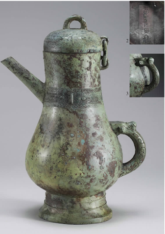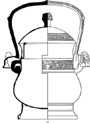 尺度重量:帶提梁高32.9、通蓋高29.7、蓋口徑13.4x10.8、器口徑11.8x9.65、腹深17.5、圈足徑14.8x11.9、圈足高4.7釐米。重4450克。