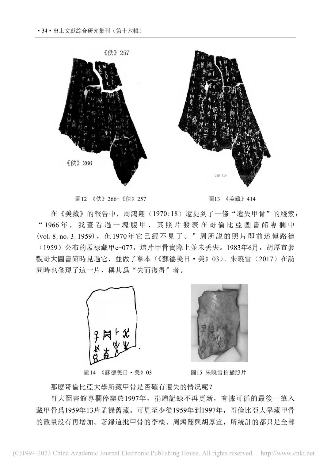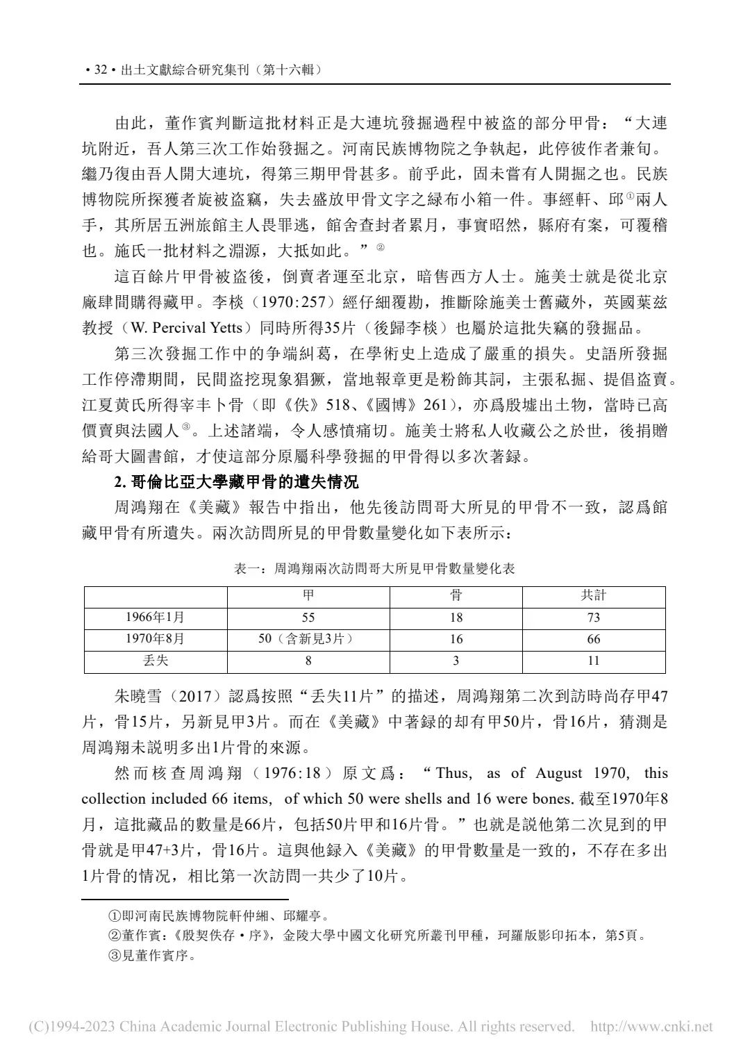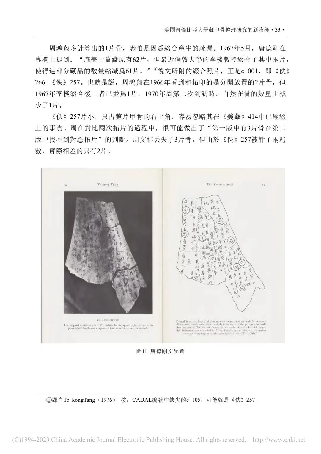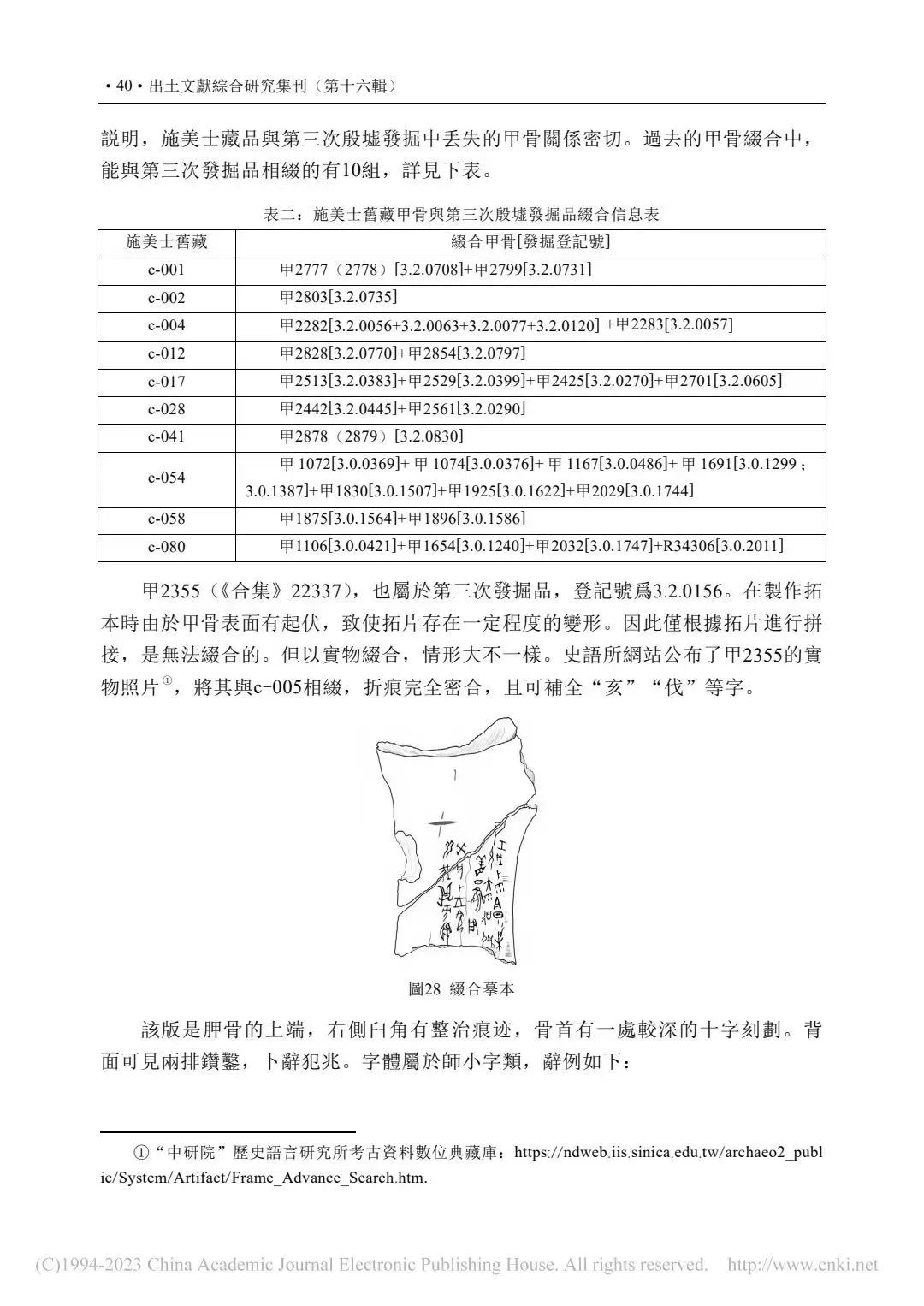 補記:本文在2022年11月14日提交終校稿後,筆者方注意到周忠兵先生《一版甲骨新綴及相關問題研究》(《古文字研究》第34輯,中華書局,2022年9月,第105-111頁)一文。文中對哥大c-001又加綴甲2591(2592),並介紹這版甲骨的綴合歷史及準確性,糾正了學界以往對其上兩處文字的誤摹誤釋。拙文原據唐德剛(1967)提到的李棪將佚257、佚266實物相綴,認為綴合者即李棪,是筆者的失察。現據周先生新綴及其梳理的綴合歷史,可將文中兩處表格進行補充修改:①P40-表二:施美士舊藏甲骨與第三次殷墟發掘品綴合信息表