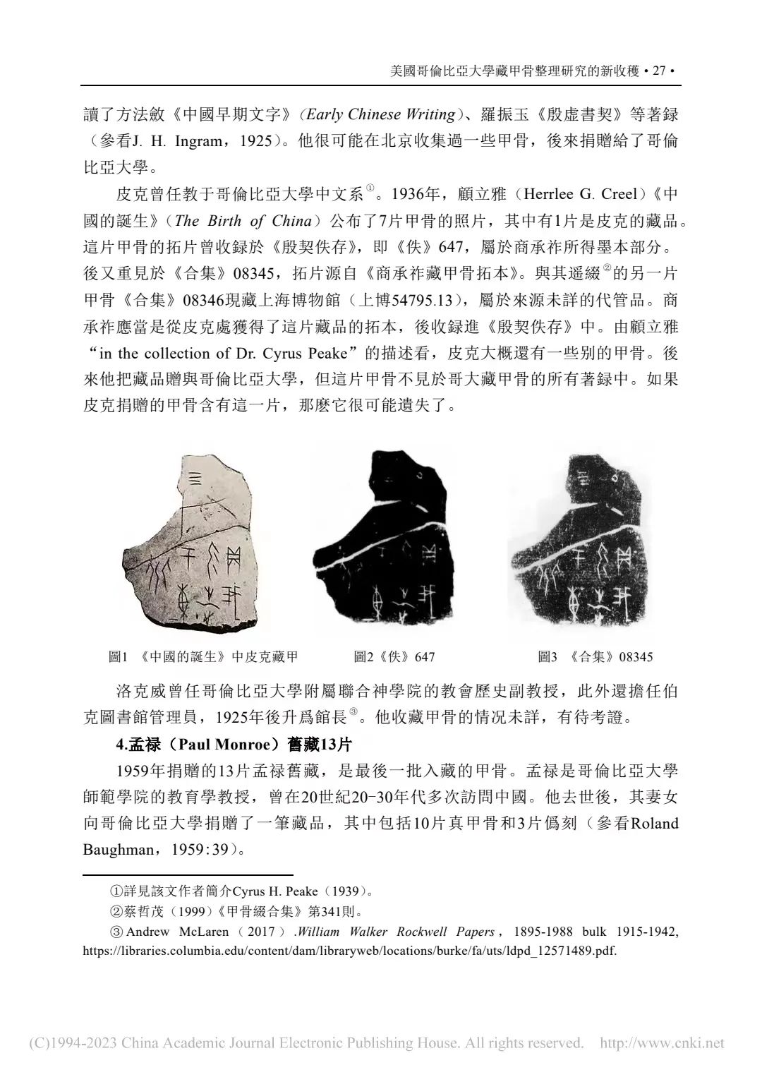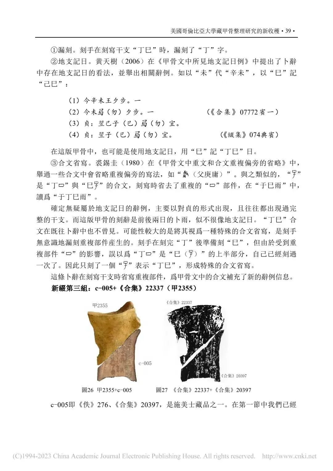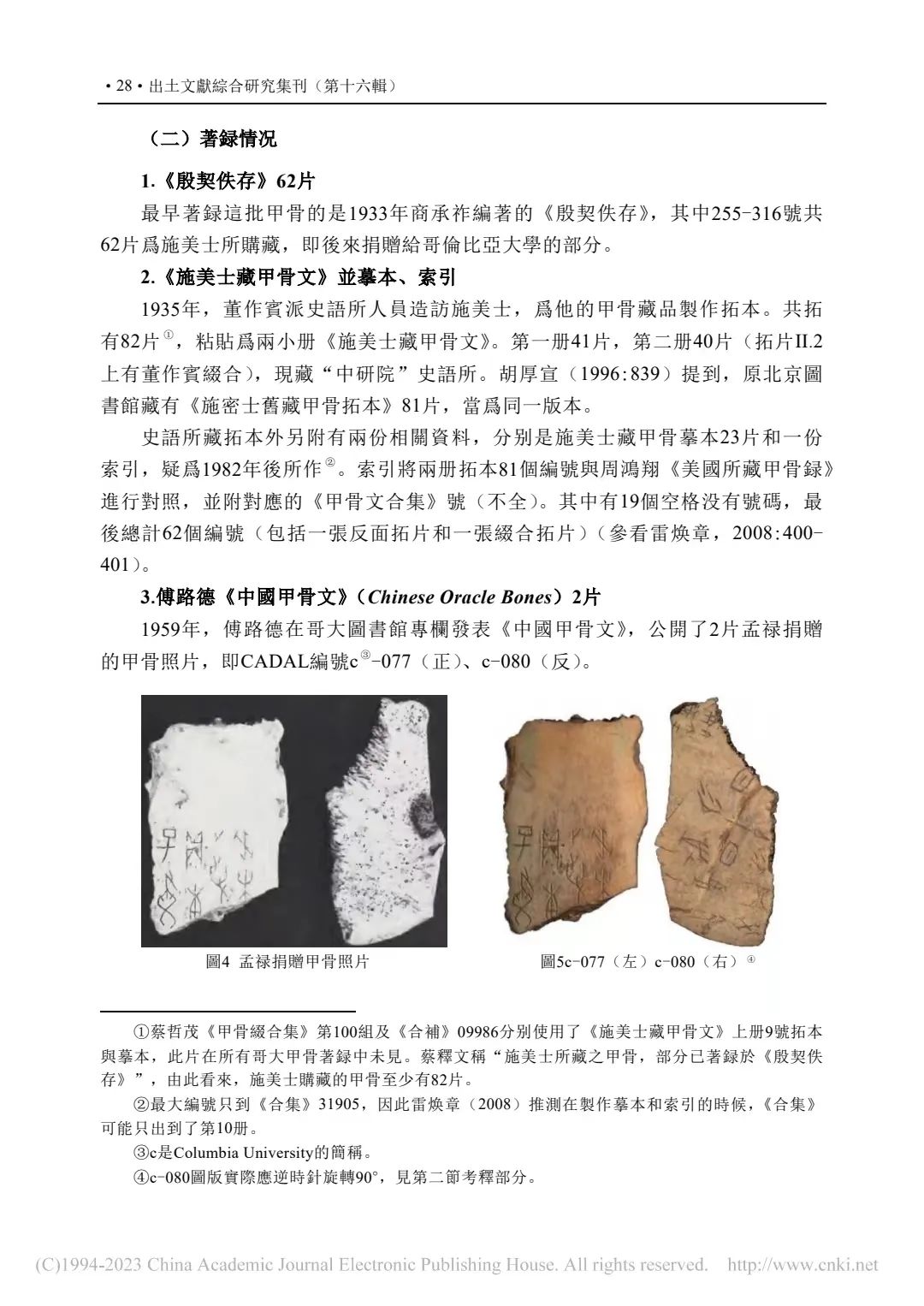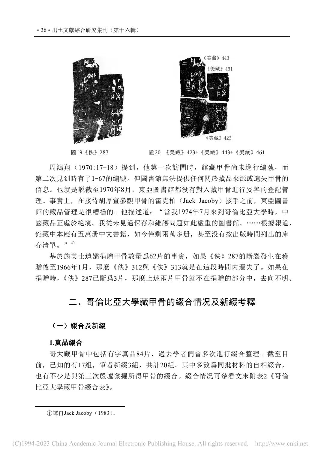 補記:本文在2022年11月14日提交終校稿後,筆者方注意到周忠兵先生《一版甲骨新綴及相關問題研究》(《古文字研究》第34輯,中華書局,2022年9月,第105-111頁)一文。文中對哥大c-001又加綴甲2591(2592),並介紹這版甲骨的綴合歷史及準確性,糾正了學界以往對其上兩處文字的誤摹誤釋。拙文原據唐德剛(1967)提到的李棪將佚257、佚266實物相綴,認為綴合者即李棪,是筆者的失察。現據周先生新綴及其梳理的綴合歷史,可將文中兩處表格進行補充修改:①P40-表二:施美士舊藏甲骨與第三次殷墟發掘品綴合信息表