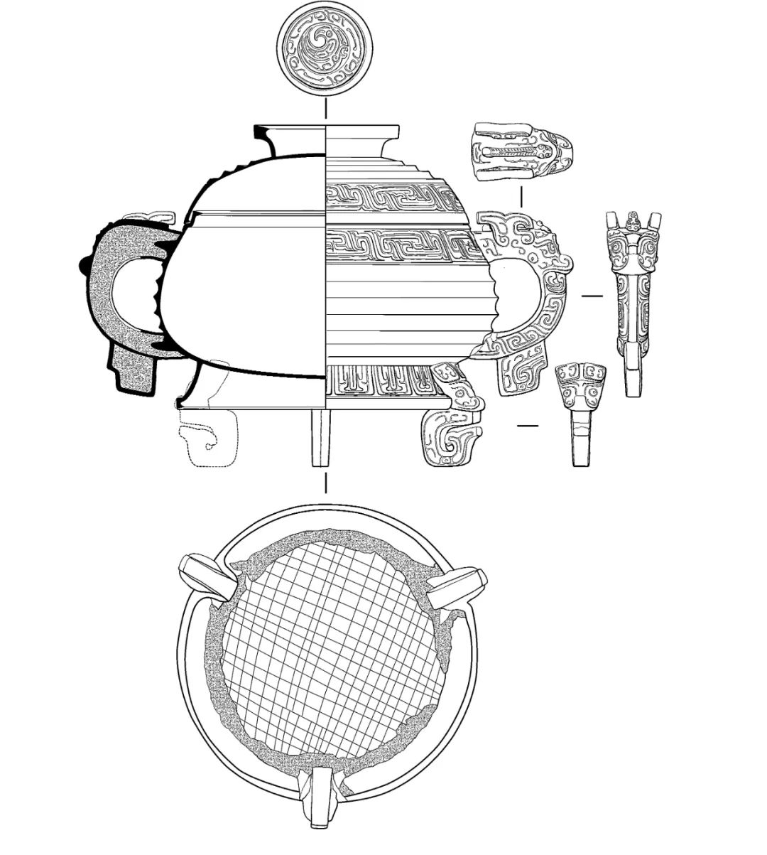 尺度重量:口徑20.5、耳距37.4、捉手徑11、腹最大徑26、腹深12.6、厚0.4、通高26.2釐米,器蓋重1.53、器身重4.22、總重5.74千克。