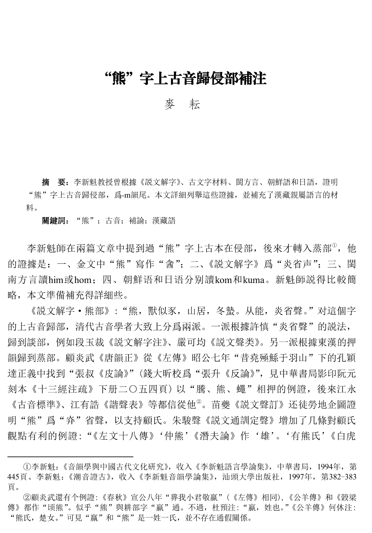 麥耘 | “熊”字上古音歸侵部補注