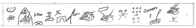 上图是东巴文占卜书《看卦辞之书·时占属相占月占》跋语中的一句,各字音义为: