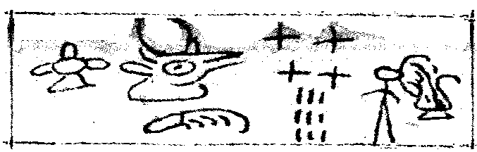 上图为东巴经《么些族的洪水故事》中的的一段,译文为:“日月眼色昏黄的事出现了,洛神色神生气的事出现了。”[11]后一句的读音是:ro11sɛ11kho33kha33thu33le33tsɯ11。其中