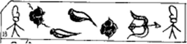 上图亦是《崇搬图》中的一句,读音为:tshe11lu33ka33ma55æ11me33dzi33pu55fæ33。译文为:“且鲁构毛赠送母鸡而去。”[10]其中