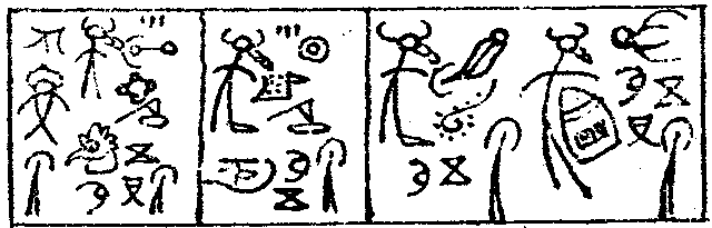 上图选自东巴经《剌母孟土》上卷,该书译文为:“像一对骏马,在草场上啃着青草。像一对牦牛,怡然抵角嬉戏。像一对黄猪,在一起拱土寻食。”[2]按实际读音直译应为:“一对骏马啃草,一对牦牛抵角,一对黄猪拱土。”三节中都有