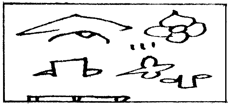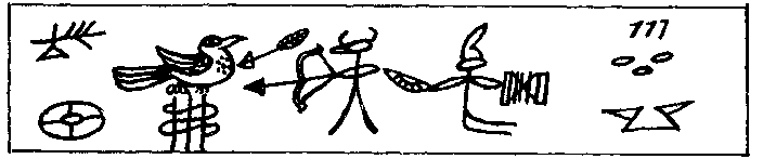 地在下,其他字(包括假借字)均置于天地之间,文字没有按语序成线性排列。东巴经的传承本是口耳相传,东巴从小跟着师傅学习,将经文熟记在心,到时背诵出来即可,所以没有必要将经文全部写出,只要写出一些关键词语,提示主要情节就行了。同时东巴经都是民间文学,伸缩变化比较自由,不逐词完全记录,也给东巴留下了个人发挥的余地。按事理将文字作图画式的平面排列,显然是受原始图画的影响。如图三是《崇般图》(亦即《么些族的洪水故事》)中的一节[6],大意是有一天早上,一只斑鸠飞来,停在园子的栅栏上,崇则丽恩(纳西族的始祖)弯弓搭箭,想射又犹豫,正在织布的天女用梭子触动崇则丽恩的手拐肘,箭就飞了出去。这段文字斑鸠必须写在栅栏之上,弓箭要拿在崇则丽恩手上,同时要对准斑鸠,天女的梭子要接近崇则丽恩的手拐肘,字与字的几何关系,按事理排列,不能有其他选择。