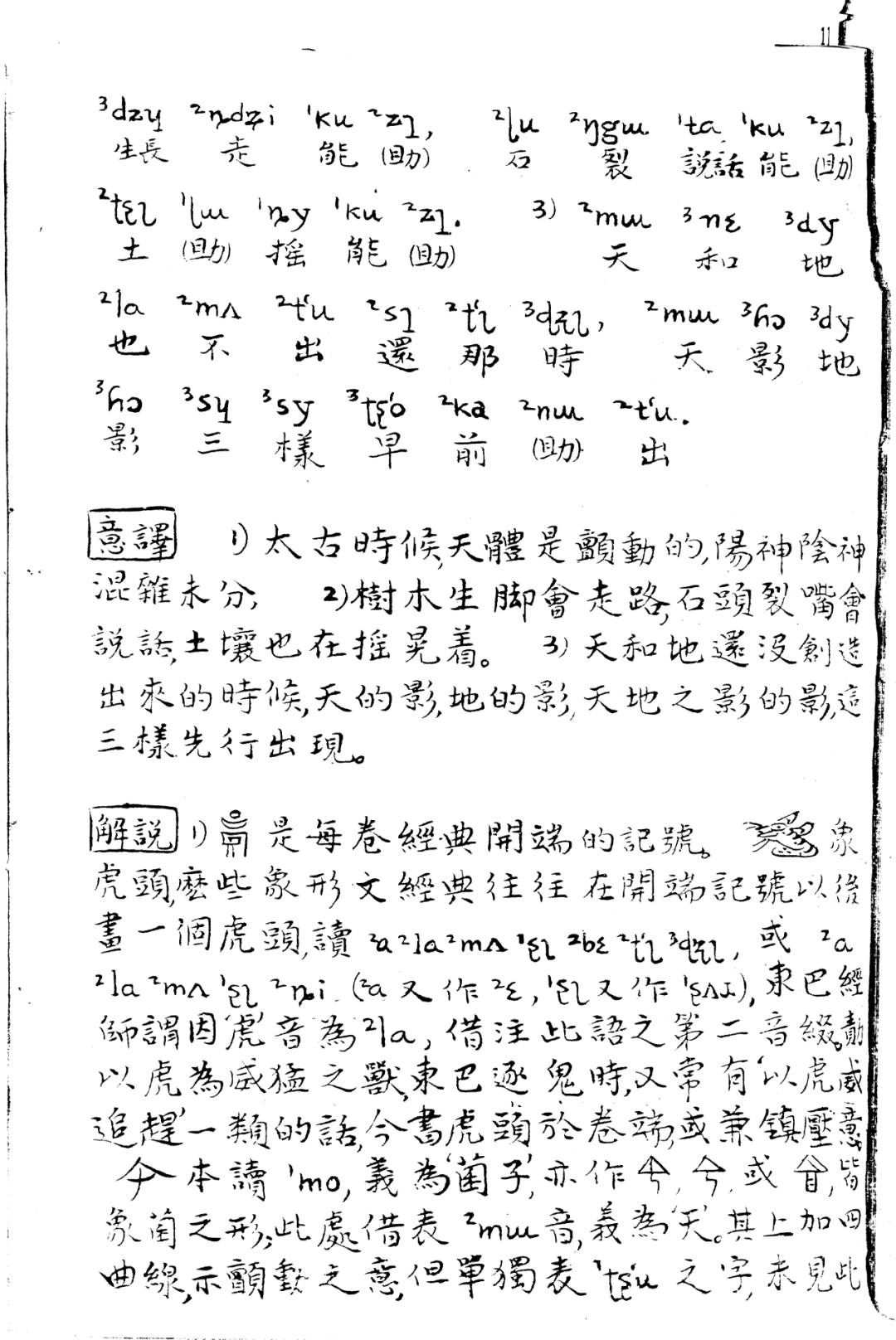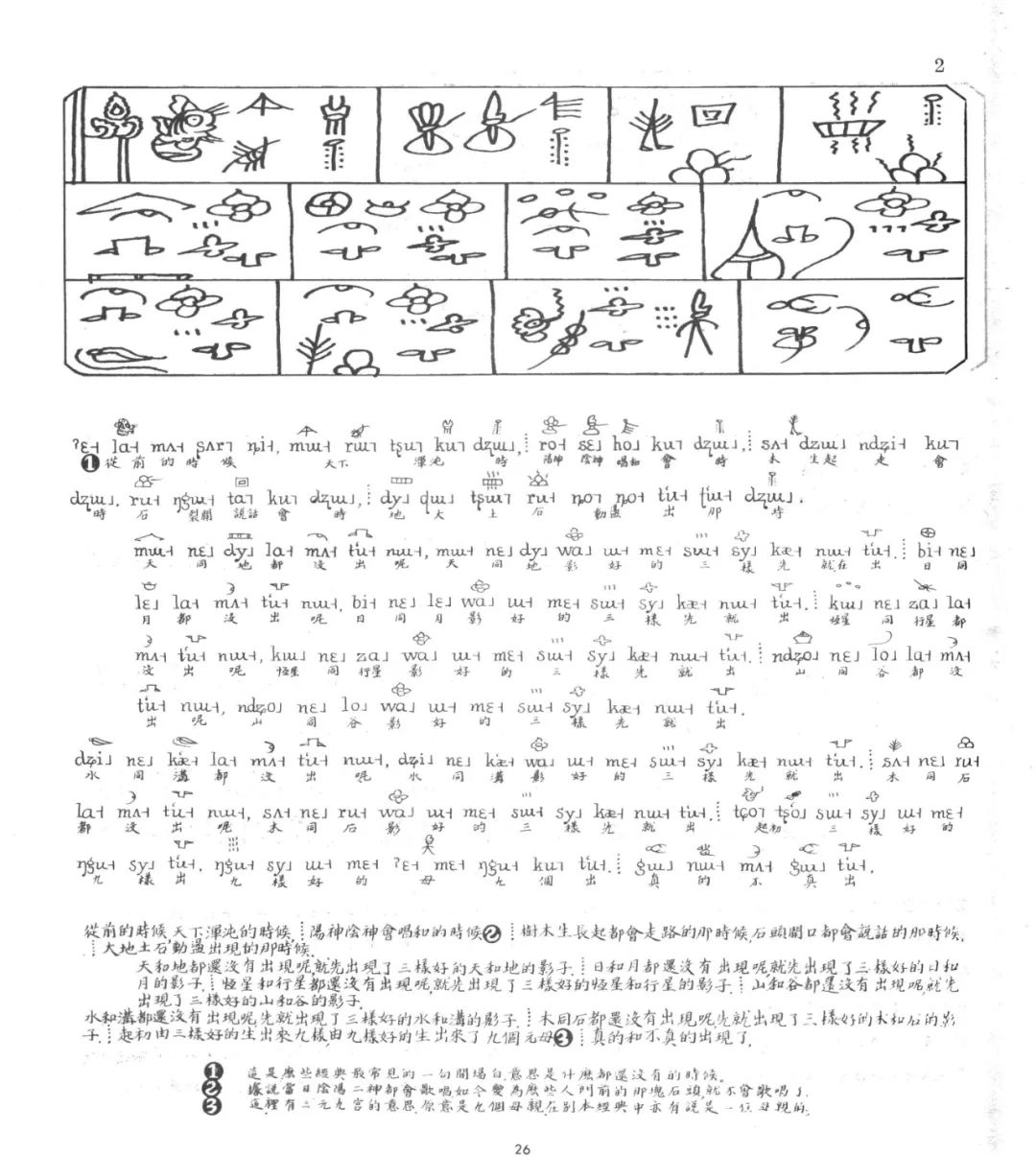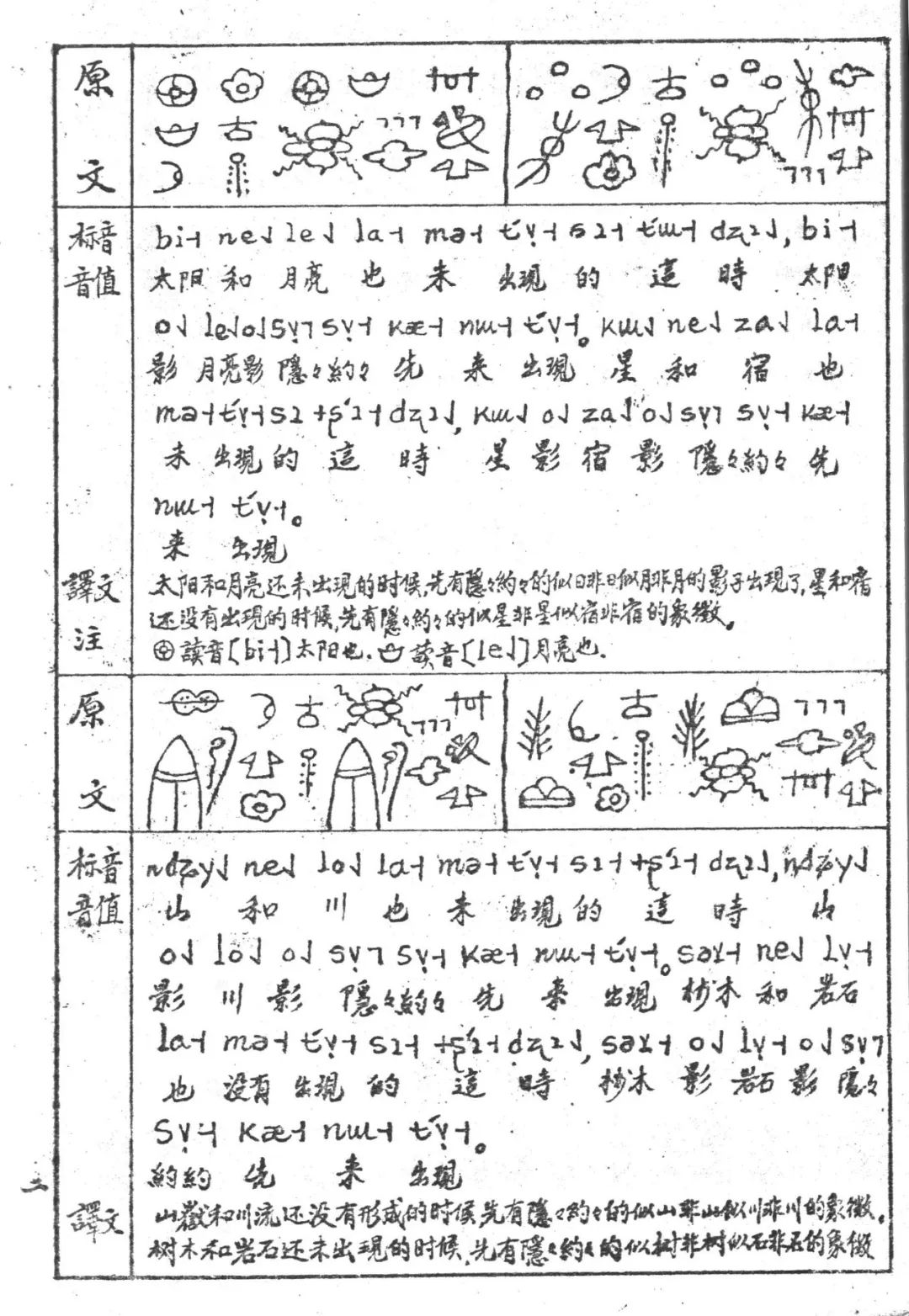 东巴文的原始性,不仅体现在字符象形宛如图画,更体现在文字制度带有一些原始的特点。与用其他文字书写的文献相比,东巴经书的字词关系至少有以下两点明显的差异。1、大多没有逐词记录语言东巴经的字词关系有字词对应、有词无字、有字无词三种情况。字词一一对应的经书都属于晚期的经书,而且数量很少,大多数经书都没有逐词记录语言。图一是《么些族的洪水故事》的第1小节[4],简释如下:
