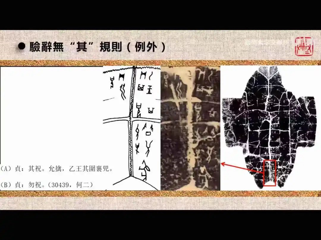 有雨”,都是指示代词。西南大学文献所的杨润龙同学,提出“在部分卜辞中‘其’字作代词时没有明确的指示对象”的疑问,黄天树教授明确了一些例证中“其”所指代的对象,同时也认为由于卜辞内容有限,部分卜辞指代对象不明确,但不影响“其”字是代词的结论。