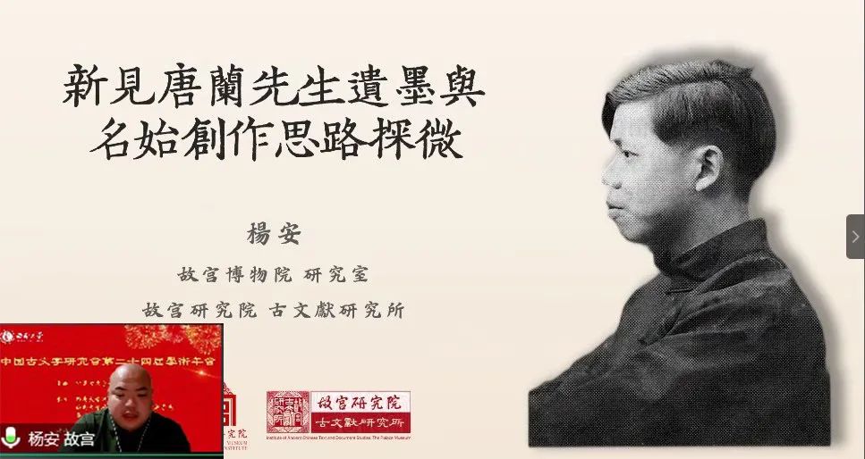 杨安老师介绍了一批新见的唐兰先生学术笔记手稿,指出手稿所包含的《唐立庵先生遗墨》册页中类似字书的内容应是唐兰先生在编辑《名始》前的试验之作,从中可以看出唐兰先生《名始》创作的思路,即以“自然分类法”为分类标准,以最古字形作为字头,下列说解,包括字书、文献以及学界对该字形的考证,最后列出古文字字形以及词例。