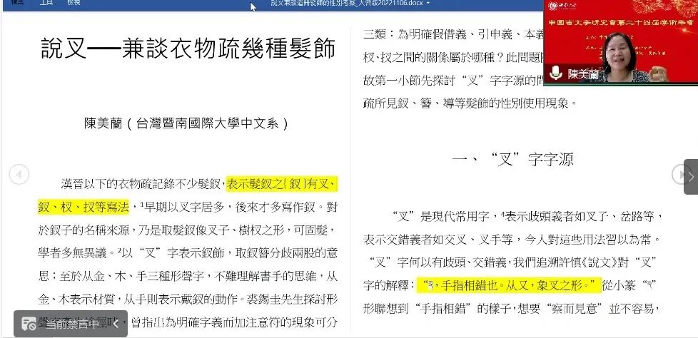 陈美兰老师对于《说文》“叉,手指相错也”提出质疑,并针对“叉”字字源,在过往研究的基础上进行了多方考察,认为李守奎先生指出“叉”字可能是叉子之象形字,应是可从的。继而针对衣物疏中几个表示发钗义的异写:叉、钗、杈、扠,讨论形声字产生途径,若以《说文》为本义,则钗、杈、扠三字乃是为明确引申义而加注意符,若本义采“叉”为叉子的象形,上述三字则是为明确本义而加注意符。此外,也通过对墓葬器物的统计与文献记载的梳理,对衣物疏中常见发饰如“钗、簪、导”的性别使用情况进行了简要说明。