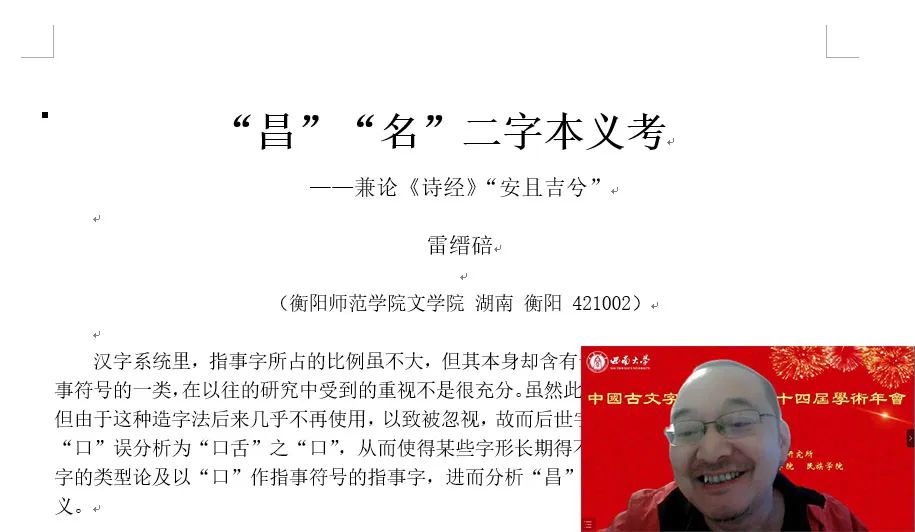 雷老师讨论了指事字的类型以及“口”作为指事符号的指事字,进而分析了“昌”“名”二字的构字理据及本义。雷老师认为“昌”应分析为在象物字“日”的基础上,加指事符号“口”以表与“日”相关的某一性状,指日光或者日光之明;“名”的构形理据与“昌”同,指月光之明。最后,指出《诗经》“安且吉兮”中的“吉”应与金文习语“吉金”的“吉”同义,指坚固、牢靠。
