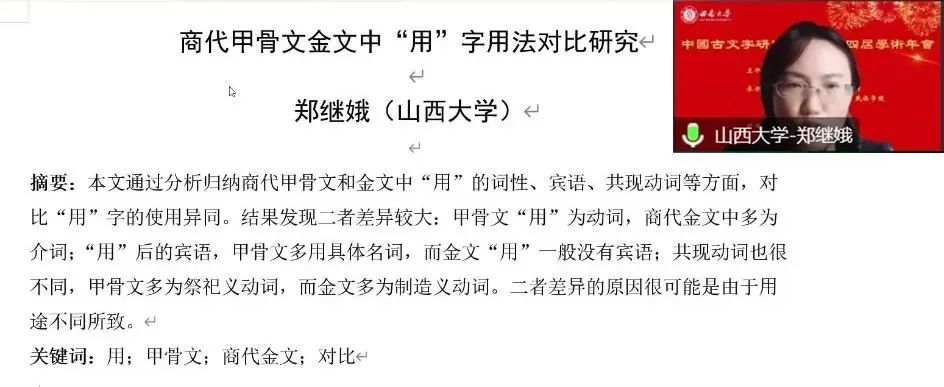 郑老师全面考察了商代甲骨文、金文中“用”的用法,指出二者差异较大:甲骨文“用”为动词,商代金文“用”多为介词;“用”后的宾语,甲骨文多用具体名词,而金文“用”一般没有宾语;共现的动词方面,甲骨文多为祭祀义动词,而金文多为制造义动词。还指出二者存在差异很可能是载体、语境的不同所致,“用”在商代语言中可能已经具有语法化的趋势。
