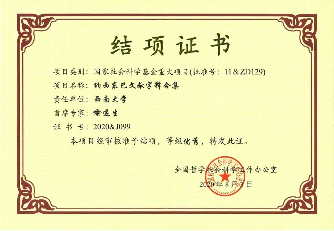 我校英国上市公司365喻遂生教授作为首席专家主持的《纳西东巴文献字释合集》(批准号11&ZD129)于今年5月通过专家评审,8月3日经全国哲学社会科学工作办公室审核准予结项,等级优秀,证书编号:2020&J099。