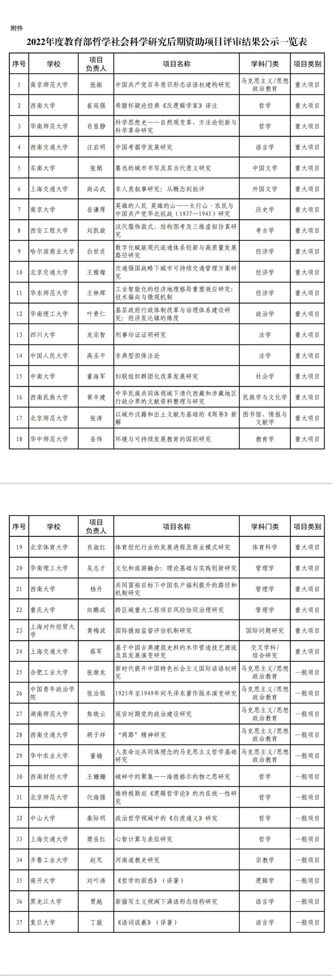 附件:2022年度教育部哲学社会科学研究后期资助项目评审结果公示一览表