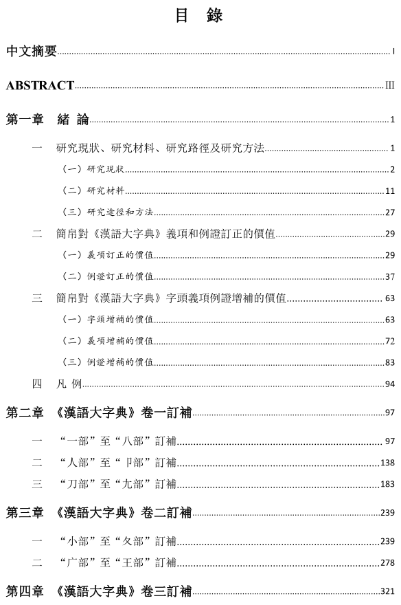 第十章結語 。全面總結本文的訂補工作,並且發表一些有關想法。具體內容包括:第一,對本文所做的工作進行總結。第二,評價《漢語大字典》第二版的修訂工作(即對第一版的修訂),主要是對有關簡帛文獻引用方面的工作進行評價,着重指出其存在的問題。第三,分析《漢語大字典》簡帛例證致誤的三個主要原因:一是簡帛文獻釋讀難度較大,二是編纂者對簡帛材料不夠熟悉,三是編纂者對簡帛材料使用不夠嚴謹。第四,提出下一步的有關修訂建議。