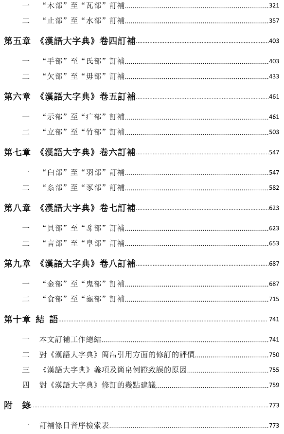 第二章至第九章爲 《 漢語大字典 》 訂補 的核心內容 。每章訂補《漢語大字典》的一卷,共分作八章。每章之下,以簡帛爲材料,按照《漢語大字典》中的字頭排序,依次闡述每條訂補內容。具體內容包括: