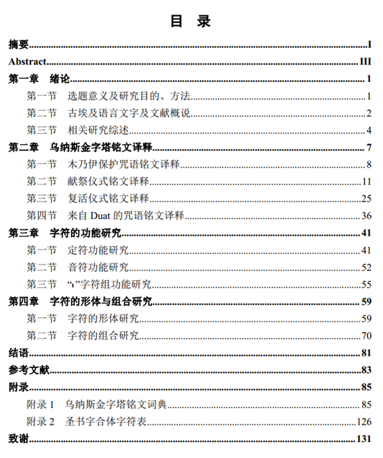 第二章是对铭文内容进行译释。乌纳斯金字塔文献由大量神话故事、祈祷文、丧葬咒语、颂歌组合而成,记录了那一时期的宗教思想、王权思想。因文献的风格、特征、目的等方面都对文字的书写和使用有一定的影响,所以论文选取了几篇在内容和形式方面都较有特点的铭文,对其进行拉丁化转译、汉文意译以及注释,以助于对文献的了解,和助于对语言文字的研究。