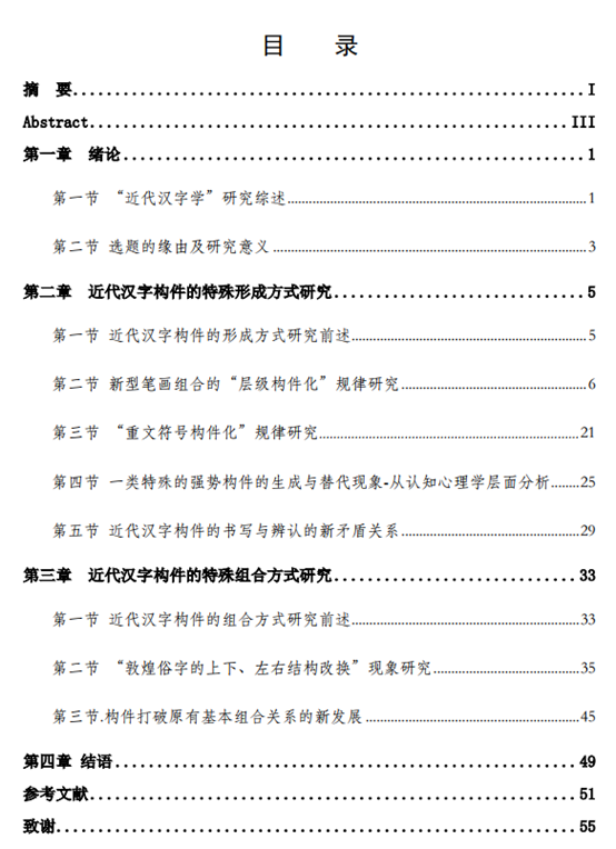 第二章是对近代汉字构件特殊形成方式的研究。原有著述大多集中在原有构件的直接转换与替代,但对于单纯的“非字构件”向“成字构件”的转化并不能严整描述该种动态的过程,中间状态是复杂的,尤其是一些构件的特殊生成状态,更是不能这样简单地进行描述,故更需要彻底地厘清。其中包括了“笔画组合的层级构件化”、“重文符号构件化”及一类独特的与使用者的认知心理相关的“强势构件生成与替代”现象。三者均是特殊的构件形成现象,补充说明了近代汉字中某些构件的特定形成过程及内在隐含的文字规律;