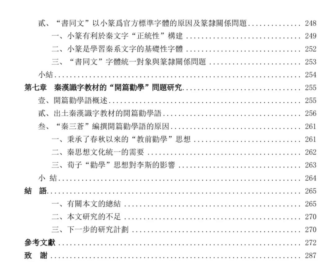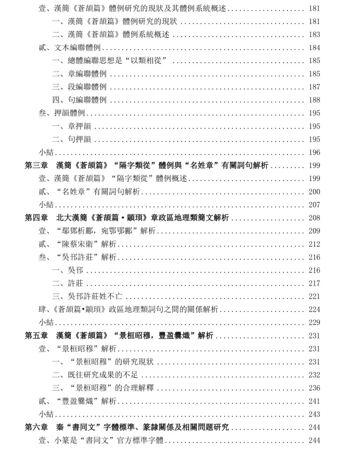 ”“陳蔡宋衛,吳邗許莊”四句。既往研究成果對該四句簡文的釋讀、訓解均未確,今深入研究,發現如下: 第一,該四句簡文所涉字詞均屬政區地理範疇,並非既往研究認爲的包含了姓氏。 第二,該四句簡文反映的是楚國(江淮流域地區)與中國北方交通往來的西、中、 東三條南北大道的情況,由西向東依次敘述,分別爲楚國西部至秦關中之大道、楚國中 部至中原洛邑之大道、楚國東部至衛國濮陽之大道。 第五章《北大漢簡〈蒼頡篇〉“景桓昭穆,豐盈爨熾”解析》。長期以來,北大漢簡《蒼頡篇》5“景桓昭穆,豐盈爨(饎)熾”二句未得到確切訓解。文獻證明,該二句簡文的字詞均與宗廟祭祀密切關聯。其中,“景桓昭穆”指祭祀時測定節氣與時辰的 景柱(表、晷)和昭穆制度。“豐盈爨(饎)熾”與“進獻粢盛”之禮有關,“豐盈” 體現該禮儀中“粢盛”豐備充盈的特徵,“爨(饎)熾”指將祭祀穀物蒸煮成熟食的“饎 爨”環節。而從宗廟祭祀的整體流程看,涉及“景桓”與昭穆制度的事務在祭祀前期體現得較爲明顯,而包括“爨(饎)熾”在內的“進獻粢盛”之禮處於祭祀中期,按照事務鋪排順序,即“景桓昭穆”在前,“豐盈爨(饎)熾”在後,《蒼頡篇》“景桓昭穆,豐盈 爨(饎)熾”的語序正與之吻合,亦可證二者名實之對應。 第六章《秦“書同文”字體標準、篆隸關係及相關問題研究——漢簡〈蒼頡篇〉的 漢語漢字史價值》。秦“書同文”是漢語漢字史與秦漢史研究的重要內容。隨着秦簡牘 與秦文字器物中大量秦隸的發現,“書同文”的字體標準、篆隸關係等問題漸有異議。今以傳世文獻記載與秦漢簡牘材料相印證,通過《蒼頡篇》早期材料的字形對比,證明 “書同文”官方標準字體應當爲秦小篆,而非秦隸。文獻證明,秦隸等“秦書八體”與 小篆共同構成秦文字對外統一的整體面貌,配合小篆參與了“書同文”運動。原因有三:第一,小篆是秦官書正體字,通行歷史久,社會聲望高,源流正統,更符合“書同文”運動中秦文字“正統性”的構建需要。第二,小篆是學習秦系文字的基礎性字體,故應先行學習。第三,“書同文”實爲秦系文字集體對六國異文的一種外向型統一,其雖以小篆爲官方字體,但並不追求秦系文字內部字體的一致性,故“書同文”後能夠出現小 篆與秦隸並行的局面。由實踐可知,漢簡《蒼頡篇》是考察秦“書同文”問題的關鍵資料,具有重要的漢語漢字史價值。 第七章《秦漢識字教材的“開篇勸學”問題研究——漢簡〈蒼頡篇〉的古代教育史價值》。“勸學”思想是中國古代教育思想的重要組成部分。在歷代識字教材中,“勸學”思想通常蘊含在工整的、有韻文意味的“勸學語”中,通過“勸學語”起着勸勉學 習、激發學習意願的作用。文獻證明,“秦三蒼”中的《蒼頡》七章、趙高《爰歷》六章、後來的《急就篇》以及斯坦因所獲漢簡中的佚名識字教材殘文均存在開篇勸學語, 可知秦漢識字教材存在開篇勸學的通例,這種通例反映了古代文字教育的教材編寫思想,相關文句亦體現了古代文字教育的教育理念與方式,對中國古代教育史研究具有重要意義。“秦三蒼”設置開篇勸學語,主要是受到先秦傳統教育理念、秦統一後的政治現實 以及主導者李斯個人意志的影響。由“開篇勸學”問題可知,以漢簡《蒼頡篇》爲代表的漢代出土文獻是考察秦漢識字教材的寶貴資料,對古代教育史研究具有重要意義。