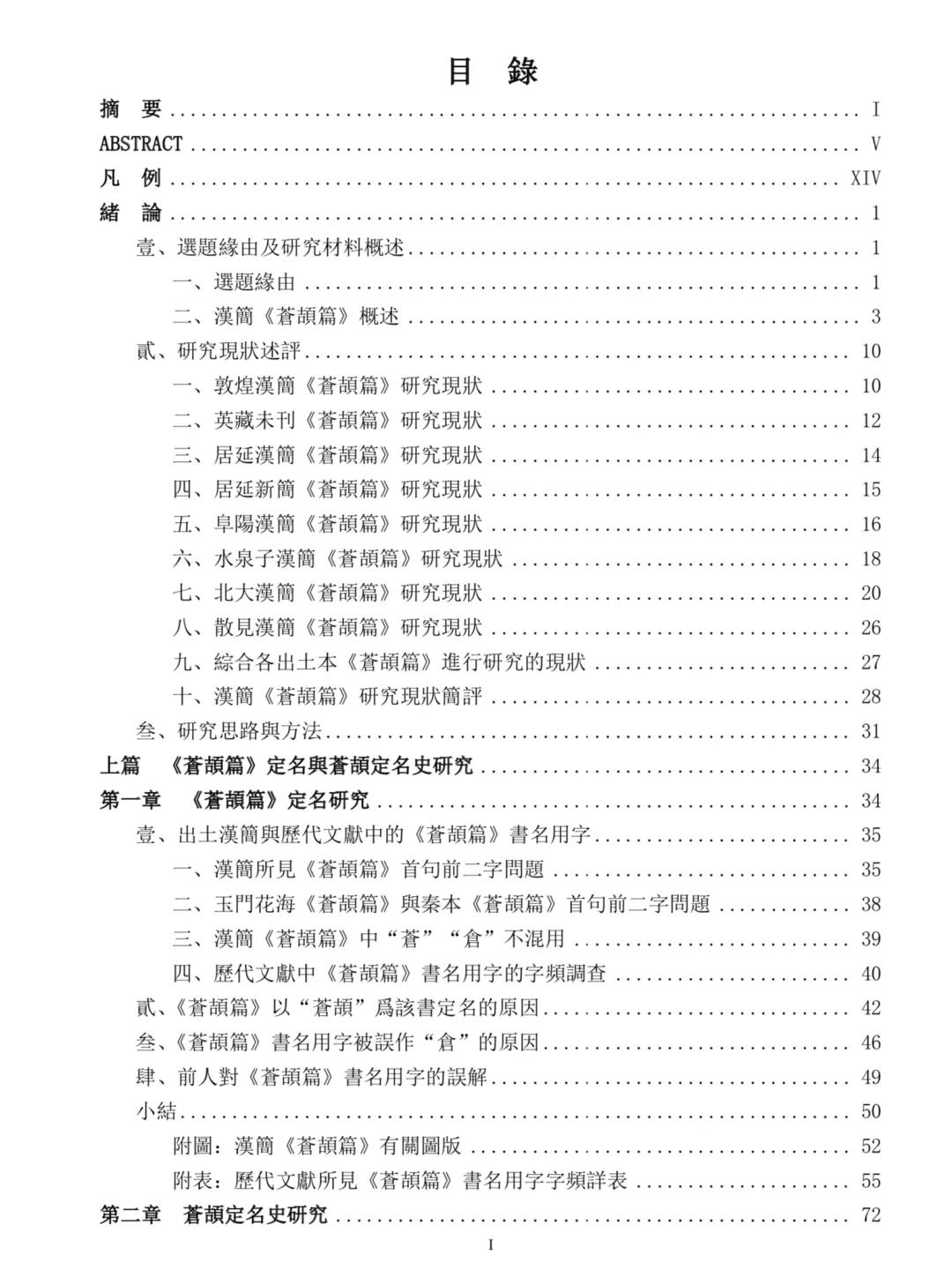 第一章《〈蒼頡篇〉定名研究》。《蒼頡篇》的書名問題長期懸而未決,是以“蒼”爲本(正)字而作“《蒼頡篇》”,還是以“倉”爲本(正)字而作“《倉頡篇》”,長期未有確論。通過出土漢簡《蒼頡篇》首句前二字,秦代人名用字偏好的調查統計以及歷代文獻中《蒼頡篇》書名用字的歷史比較,認爲“蒼”“倉”二字在秦文字中已完成分化,“倉”並非《蒼頡篇》書名原用字,該書名自秦代起就應當用“蒼”而作“《蒼 頡篇》”,作“《倉頡篇》”者是漢以後人們逐漸訛用而漸成主流的。 總之,秦代開蒼頡定名之先河,定爲“蒼頡”,漢代發揚光大。魏晉以降,該定名的正統地位下降,中古以後“倉頡”一名逐漸變成正統,歷經明清兩代而延續至今,此爲蒼頡定名一事的基本歷史。今據蒼頡定名歷史而提倡,因秦漢文明是中華文明的重要源頭之一,秦漢時期也是蒼頡傳説最主要的傳承、創造與發揚時期,對蒼頡定名問題最具話語權。而“倉頡”一 名後來雖獲發揚,但畢竟晚出。故以歷史源流論,今宜將蒼頡之名統一恢復作“蒼頡”。並且,出土材料已有力證明,《蒼頡篇》書名當作“《蒼頡篇》”,儘管中古以後常將人名寫作“倉頡”,今也宜以“蒼頡”統一之,否則,書名與人名將自相矛盾。 下篇 漢簡《蒼頡篇》其他相關問題研究 第一章《〈蒼頡篇〉成書研究》。《蒼頡篇》的成書情況史籍多有記載,但一些具體問題仍然模糊,今結合傳世與出土文獻,對相關問題予以考論,發現如下:第一,通過《史記》、秦《瑯琊臺刻石》與漢簡《蒼頡篇》的互證與分析,認爲《蒼頡篇》成書的具體時間應當在秦始皇二十六年,與“書同文”運動的起始時間相同。第二,李斯撰寫 《蒼頡篇》時的職務爲廷尉,爵爲卿,並非如漢代文獻所言爲丞相。第三,通過對出土秦漢資料中姓氏用字的調查統計,以及“母”“毋”在姓氏中音讀,認爲《博學》篇作者名不應當爲“胡母敬”,而應當爲“胡毋敬”。第四,“秦三蒼”編撰時有過統一協商與收字分工,其收字範圍的劃分應當與作者身份及其專業特點有關。 第二章《漢簡〈蒼頡篇〉體例研究》。漢簡《蒼頡篇》體例是研究《蒼頡篇》問題的重要基礎,長期以來,學術界相關研究成果存在系統性較弱、全面性不足以及術語化 程度較低等問題,亟待解決。今以漢簡《蒼頡篇》爲依據,深度整合既有研究成果,層層描述,有所發明,構建起系統性、全面性、深入性、術語化程度均較爲顯著的漢簡《蒼 頡篇》體例系統,從橫縱兩個方向對漢簡《蒼頡篇》體例面貌做出清晰描述,以期能有益於漢簡《蒼頡篇》的進一步研究。 第三章《漢簡〈蒼頡篇〉“隔字類從”體例與“名姓章”解析》。漢簡《蒼頡篇》字詞編聯存在“隔字類從”形式,即一句之中詞義相關的兩個字詞並不相鄰,而是中間 隔有一字,形成 ABAB 式,其中被隔開的兩個“A”或兩個“B”具有同義、反義、同義 類或同主題的關係。漢簡《蒼頡篇》“名姓章”語句的語境不顯,不易解讀,今運用“隔 字類從”體例,可較好解讀“焦黨陶聖”“程頎樛平”等 13 例句子中的相關詞義。人名編聯採取意義關聯的“類從”形式,淵源至少始於春秋,作用於字書時,可通過聯想 實現快速記憶,這在《急就篇》中亦有繼承。 第四章《北大漢簡〈蒼頡篇•顓頊〉章政區地理類簡文解析》。北大漢簡《蒼頡篇• 顓頊》章有政區地理類簡文,即“鄢鄧析酈,宛鄂