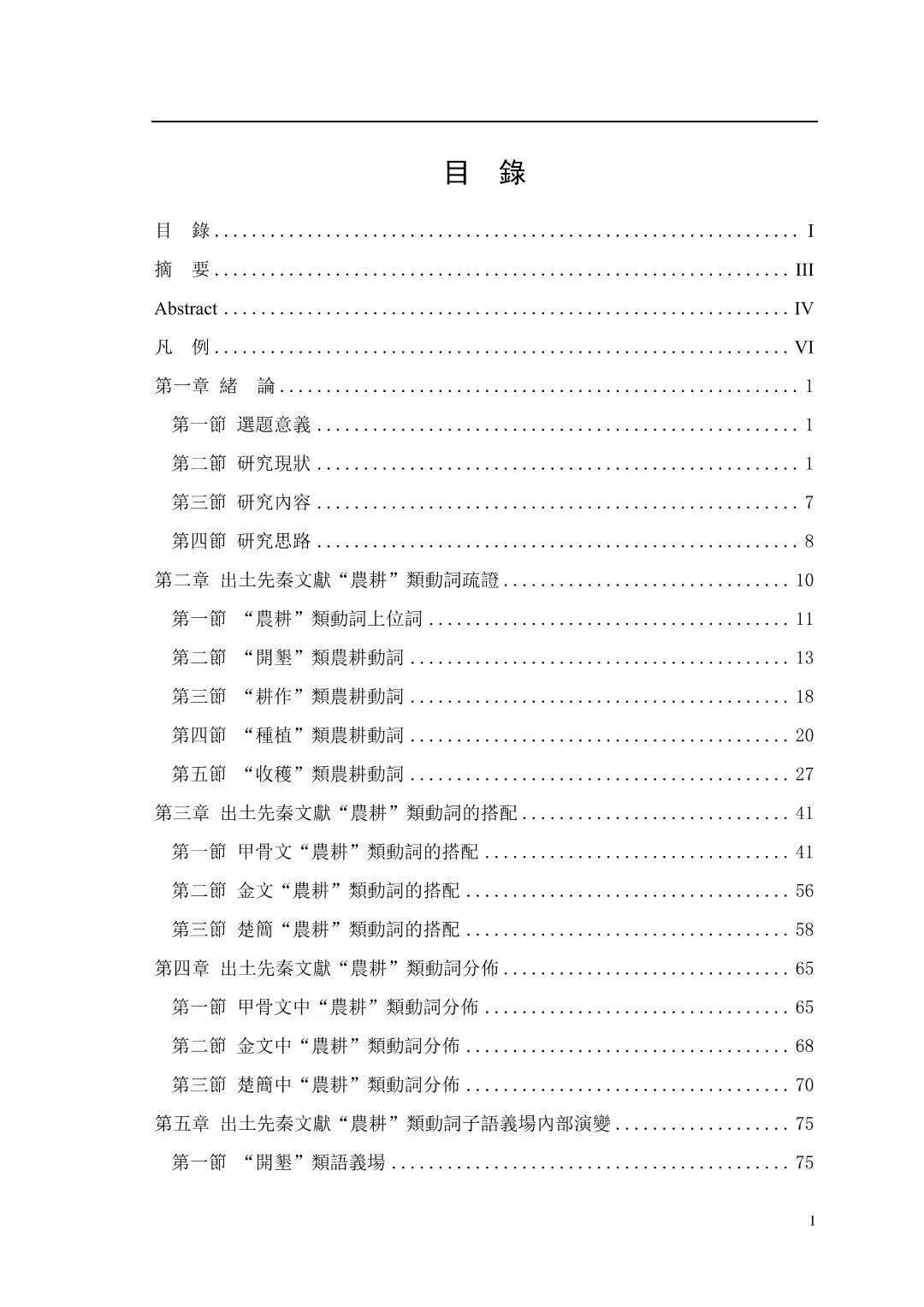 中國是農業大國,從舊石器時代晚期開始,植物種植就進入到了人們的生活中,是維持人們生存的重要活動;詞是最小的能夠運用的語言單位,詞的研究可以讓我們了解一個時代的語言情況。“農耕”類動詞的研究,一方面可以揭示相關時期農業耕作的歷史面貌,另一方面也可以描寫出“農耕”類語言詞彙的基本面貌,揭示其語義演化的一般規律。本文以甲骨文、金文、楚簡三類出土先秦文獻為研究材料,運用語義場理論、共時和歷時相結合的方法,輔之以詞頻統計法和圖表展示法,對不同材料中的“農耕”類動詞進行研究。緒論部分主要探討了“農耕”類動詞的概念以及研究情況,根據前人的研究確定了判斷的標準,然後從語義角度劃分了子語義場。第二章對出土先秦文獻“農耕”類動詞進行疏證,並確認其釋字與釋義;第三章對每個農耕動詞進行語法搭配的分析,考察其作動詞時在句子中的位置以及與其搭配的主語、賓語等句法成分的使用情況。第四章是從共時角度與語義場層面對詞的分佈與語義場內部演變進行研究。一是從共時角度對不同材料中的農耕動詞進行頻次分佈研究,考察每個子語義場的農耕動詞使用频次差異,以及農耕動詞在同一類材料的不同時期的分佈差異。甲骨文與楚簡的“農耕”類動詞在不同時期的分佈差異,皆可與歷史上王朝興衰的階段相互印證。金文中農耕動詞使用頻次差異,則反映了“耤”受周王室的影響,從單純的農耕行為發展到表示農耕和祭儀兩種行為,重要性也在上升。二是從語義場層面考察子語義場的內部差異和演變,總結變化特點為:①總體特征是從大量使用專用詞到大量使用上位詞;②部分農耕動詞存在跨語義場移動現象,詞義有所變化但依舊處在“農耕”類動詞的語義場;③部分詞的詞義保留較為完整,詞義穩定性較強。