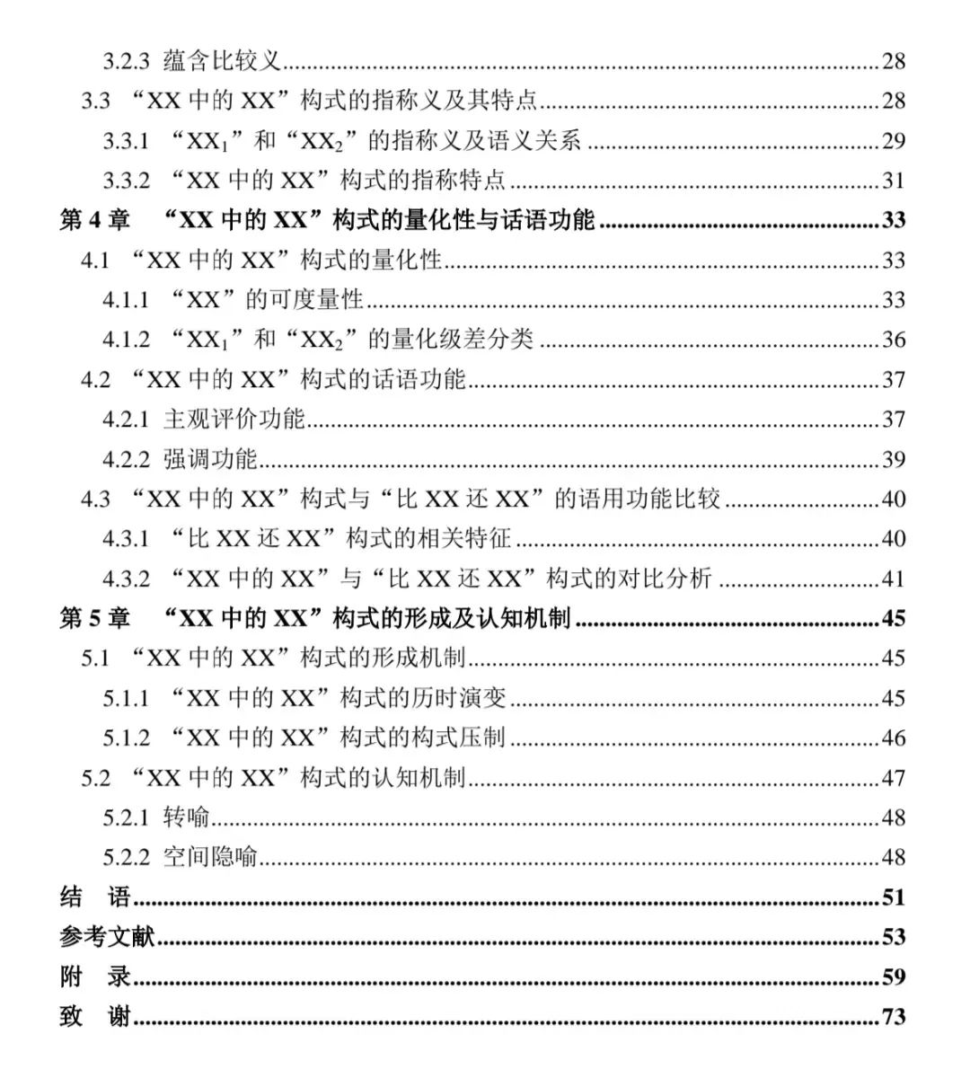 “XX 中的 XX”构式是现代汉语复叠格式中的一种,具有主观极量义。本文在前人研究的基础上,以三个平面理论、构式语法理论以及转喻和空间隐喻理论为理论分析依据,对“XX 中的 XX”构式进行了相关探讨。本文共分为六个章节,主要内容为:第一章 绪论部分。说明了本文的选题缘由,梳理了相关研究,介绍了本文运用的相关理论和研究方法。其中,文献综述的内容包括构式语法理论研究、主观量的定义和分类以及与主观量构式相关的研究。第二章 主要对“XX 中的 XX”作为构式的理据性、构式各组成成分及构式的句法功能进行了详细的分析,得出变项“XX”的词性主要为名词,构式整体也为名词性成分,普遍充当句子成分中的宾语。第三章 分别讨论了可进入构式的变项“XX”及构式整体的语义特征,认为名词性“XX”具有描述性、程度义和蕴含比喻义的语义特征;形容词性“XX”在量幅空间上具有可伸缩性的语义特征;动词性“XX”具有程度义的语义特征。此外,分别讨论了前后“XX”的指称义,同时分析了前后“XX”的语义关系。第四章 主要分析了构式的量化性和话语功能,总结出能够进入该构式的词都具有可度量性,前后“XX”在量化级差分类上可粗略地分为绝对极量和相对极量。得出构式具有主观评价和强调的话语功能,并重点将其与同类型的“比XX还XX”构式进行了语用上的比较分析。第五章 对构式的形成机制及认知机制进行考察。得出构式的形成机制与历时演变和构式压制密切相关。对于构式的识解,主要是通过转喻和空间隐喻的认知机制完成的。第六章 总结了本文关于“XX 中的 XX”构式的研究结论,指出本论文研究的不足之处。关键词:主观性;极量;构式;转喻;指称