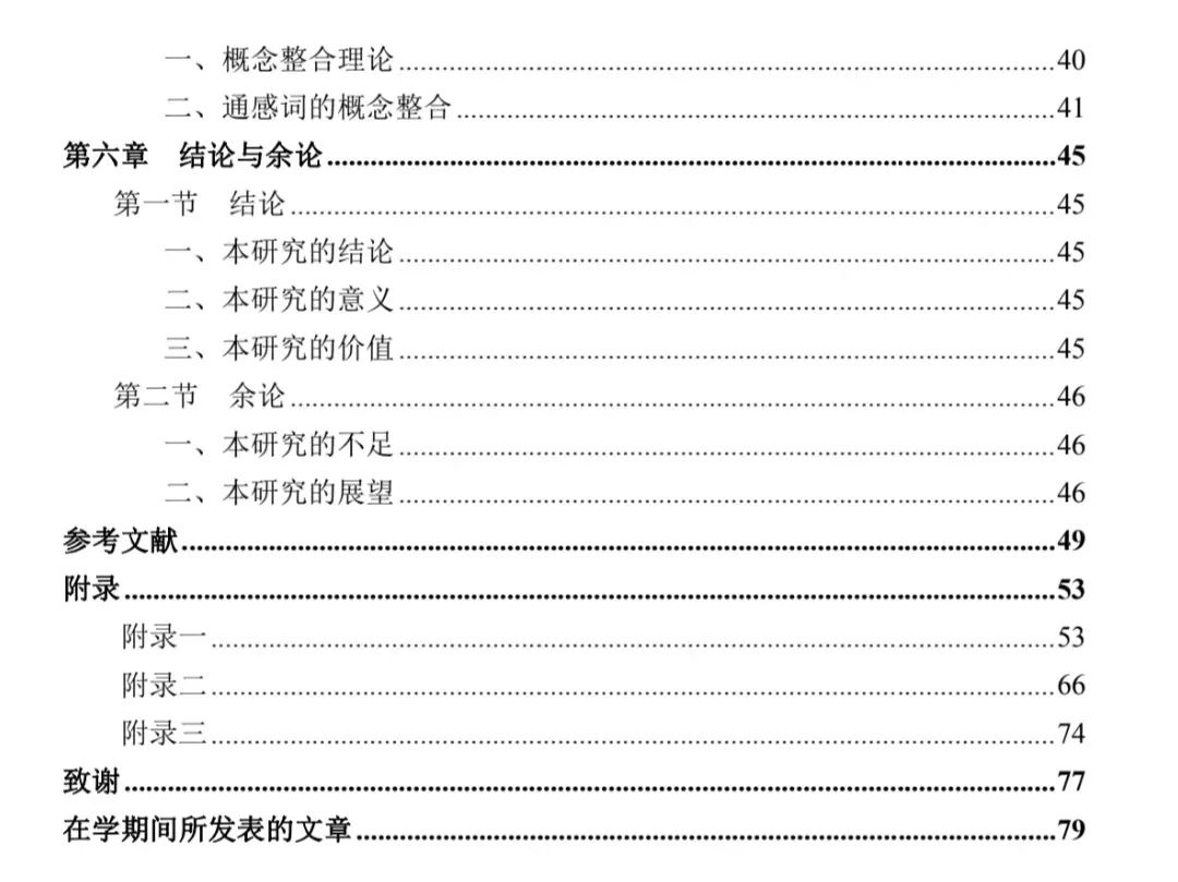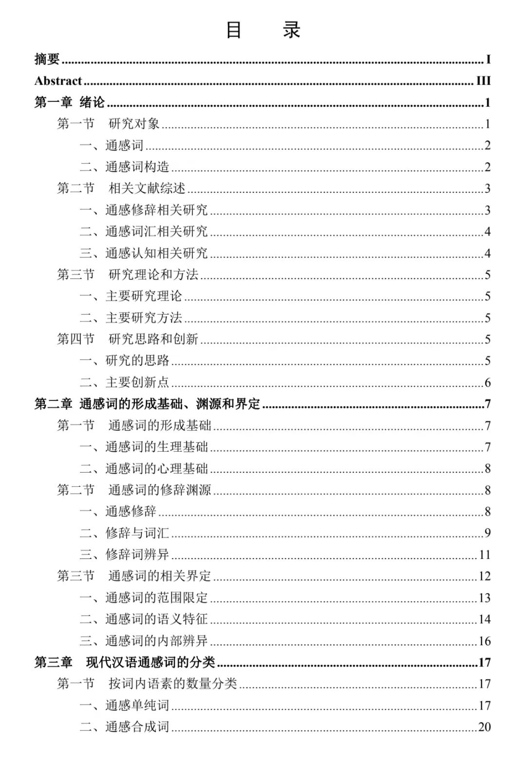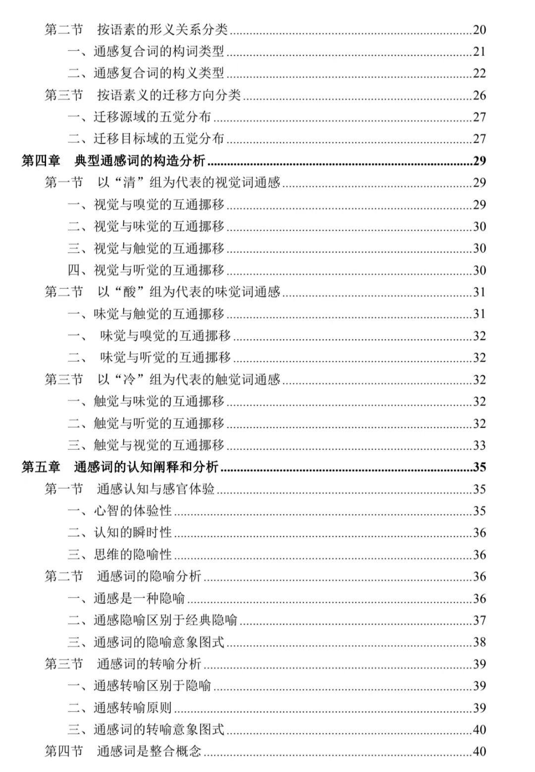 第六章 结论与余论。从起源看,通感词的深化研究,揭示了汉语修辞与词汇的互相作用;从过程看,通感词经过了两种通感模式和系统化的认知机制作用,体现出语言机制、语言材料、语言使用者三位一体的格局;从结果看,其价值和意义体现在修辞学、造词法、词汇学、语用学等诸多方面。最后对未来的相关研究加以展望,在互联网飞速发展和计算机科学更加成熟的今天,语言研究有望取得技术及理论的新突破。