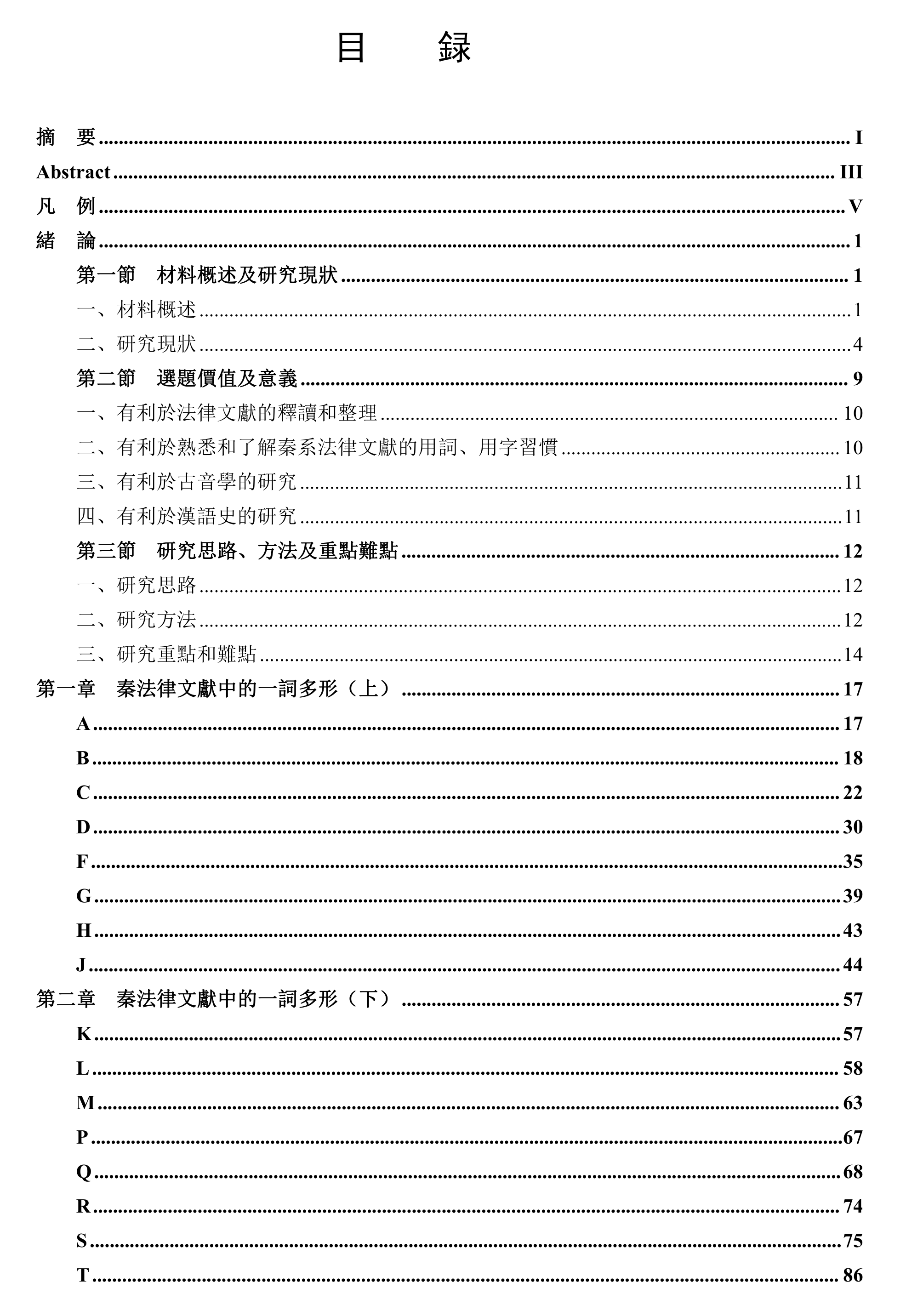 本文緒論部分,首先界定相關術語,在此基礎上介紹五宗材料所涉及的法律文獻内容、年代信息、書寫特點,並對五宗材料做時段劃分,以便觀察一詞多形的歷時變遷。然後,介紹字形與音義問題以及秦法律文獻字詞關係的研究現狀,梳理相關研究成果。最後,介紹本選題的學術價值、研究思路、研究方法、研究重點難點。