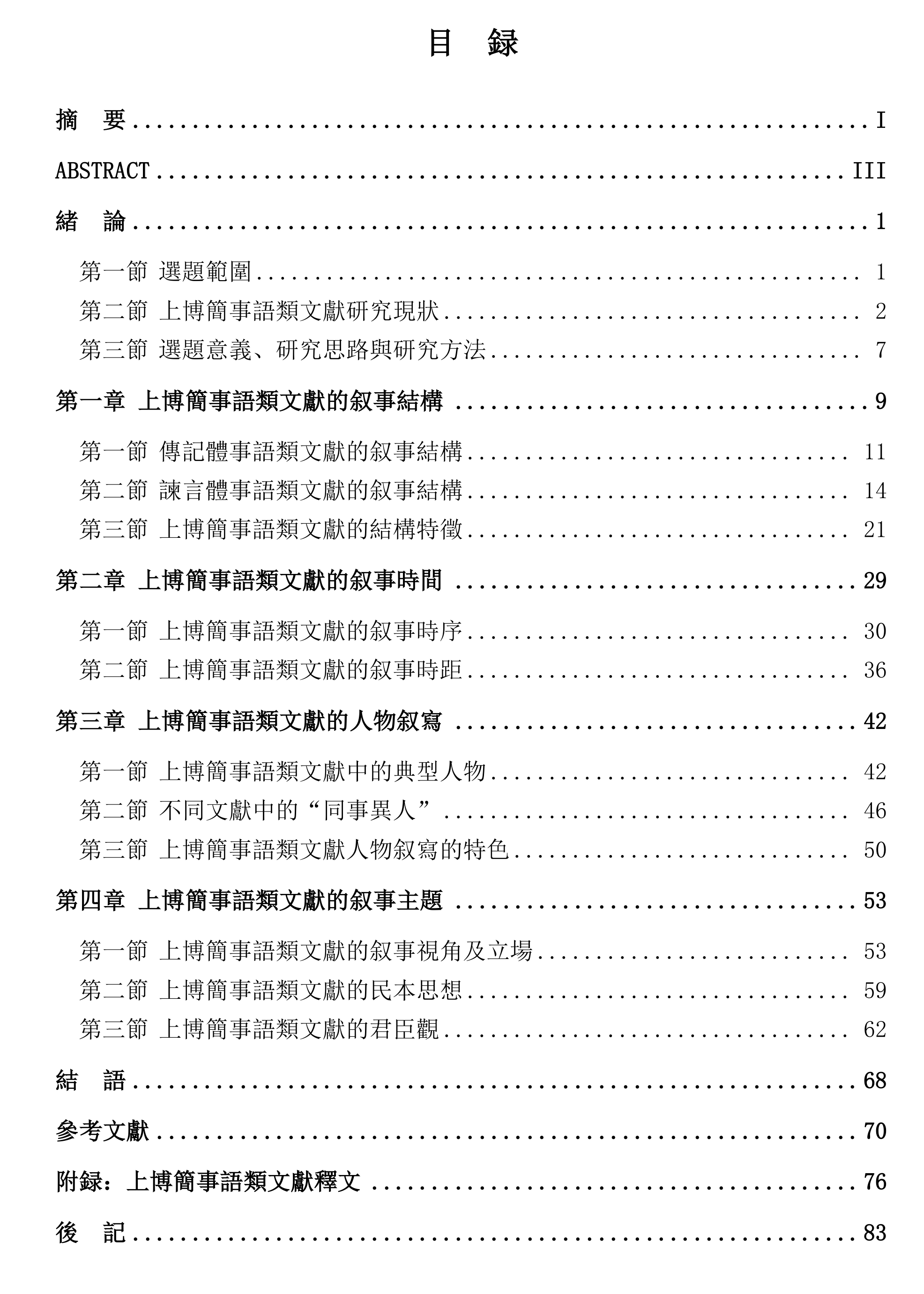 本文擬從叙事結構、叙事時間、人物叙寫等角度對上博簡事語類文獻進行整理與分析,以期探究上博簡事語類文獻中的叙事特色和叙事者意圖,推進對於上博簡事語類文獻史學價值的挖掘,對研究文獻流傳問題提供一個角度。論文主要分爲一下幾個部分: