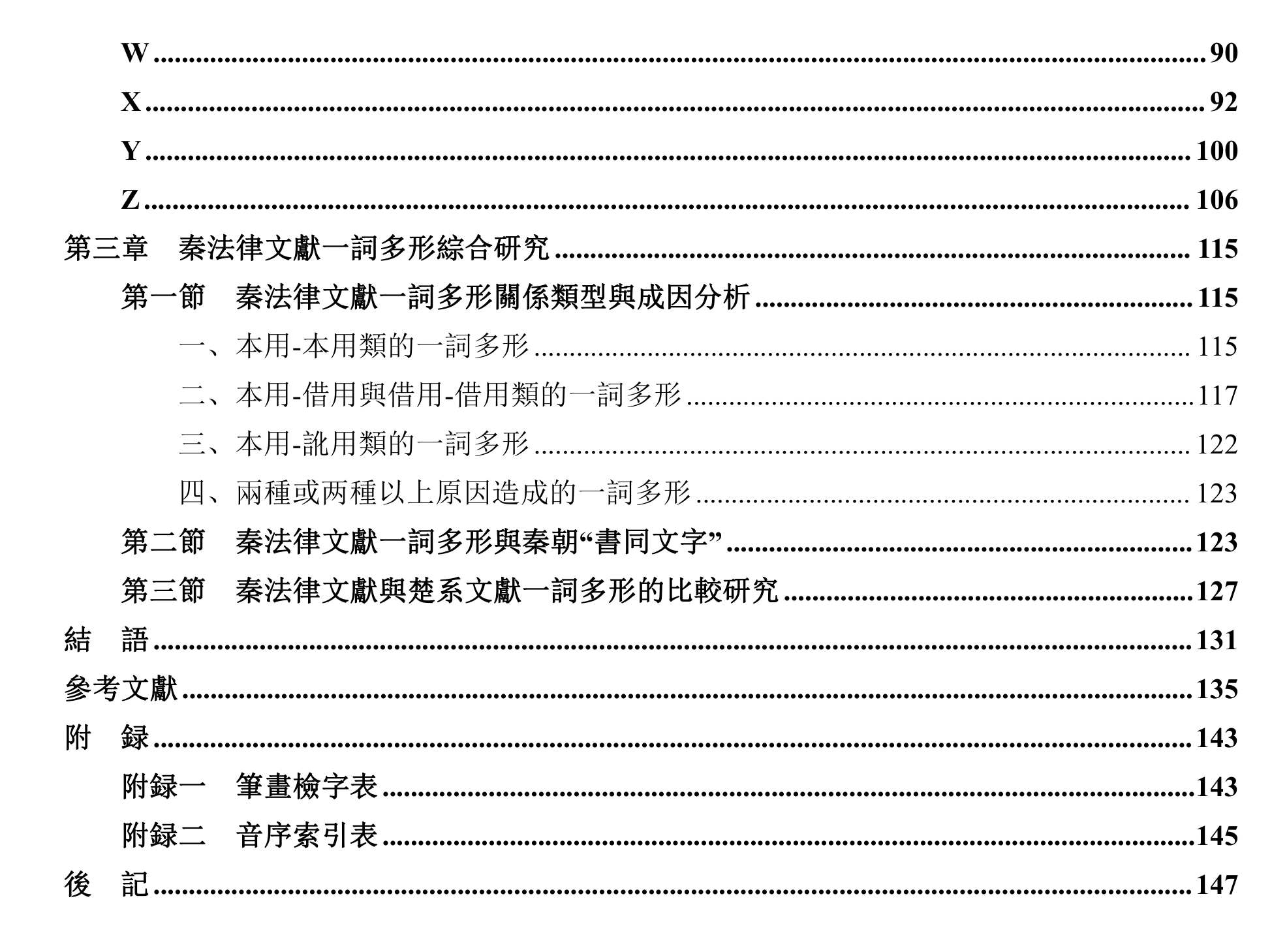 正文主要分爲三章,前兩章是個案例析,將涉及一詞多形的 145 個詞按照音序 A-Z 排列。各詞頭下,首先呈現按材料類别、時代先後劃分的字頻統計表,直觀呈現該詞的習用字形以及用字變化。接着分析該詞各個用字的字形結構、本義,從而判斷諸用字與該詞的關係,以及諸用字與本用字的關係。再者,梳理諸用字在秦法律文獻中的用法,以及在傳世文獻以及其他出土文獻中的相關用例。復次,結合秦朝“書同文字”政策、書手等因素分析該詞出現一詞多形的原因。最後,綜述所涉諸字與該詞的關係,即本用、借用、訛用,並附上字詞對應關係圖。