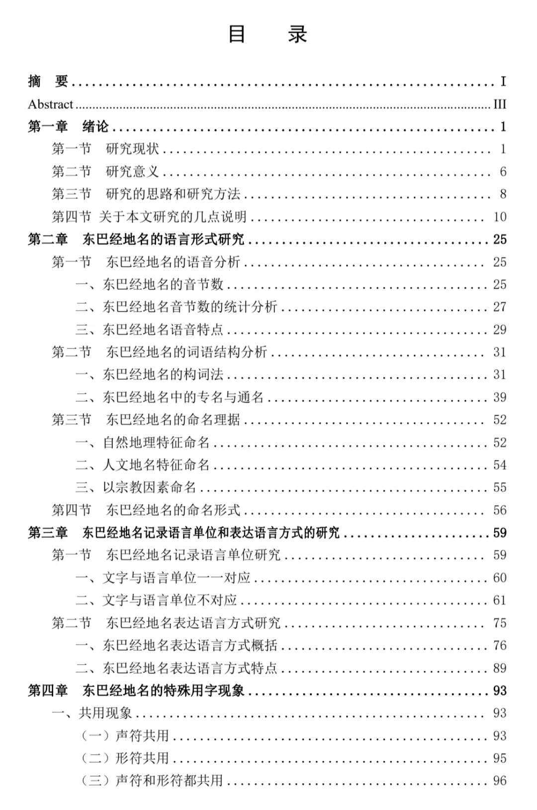 第一章为“绪论”。本章首先对东巴文在国内外研究现状进行了概述,其次就本文的研究意义、研究思路和研究方法进行了分析,最后对本文研究材料的选取和凡例、经书中所见的地名材料以及收集材料时切字标准进行了说明。