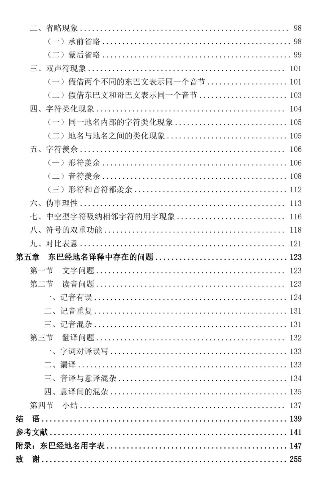 第四章为“东巴经地名的特殊用字现象”。本章主要探讨了地名在记录过程中出现的一些特殊用字现象,如共用现象、省略现象、双声符现象、字符类化现象、字符羡余现象、符号的双重功能等。