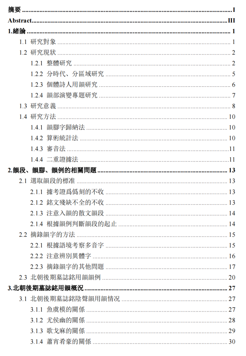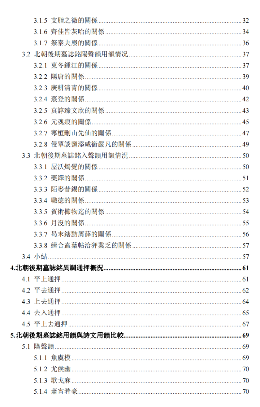 論文主要分成五個部分,第一章緒論主要探討本選題的研究對象、研究現狀、研究意義及研究方法。第二章介紹韻段、韻腳、韻例的相關問題,指出摘錄韻字中應注意的問題,梳理北朝後期墓誌銘文的用韻韻例。第三章整理韻段,統計數據,分析北朝後期墓誌銘所反映的各韻的分合關係。第四章總結概括北朝後期墓誌銘文的異調通押情況。第五章把詩文用韻與墓誌用韻的結論進行對比,主要是與同時期北方和南方詩文用韻進行對比。