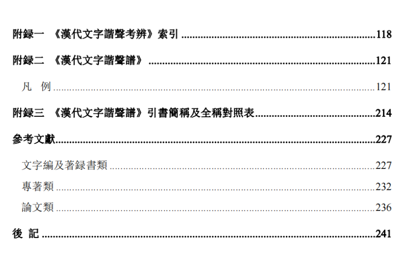 第三部分是附録,一方面是按字頭的聲韻排序,爲正文諧聲考辨之字製作了索引表,另一方面則是呈現了漢代文字的諧聲譜。