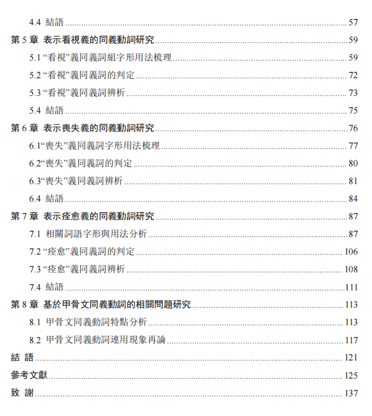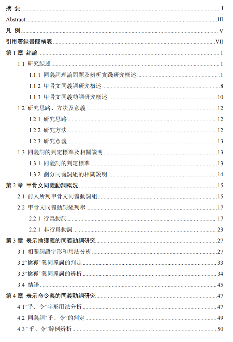 論文的主體部分共有 8 章。第 1 章爲緒論,綜述前人對同義詞的研究成果,簡要闡述本文的研究思路、方法和意義,確定本文同義動詞的判定標準和原則。第 2 章爲甲骨文同義動詞概況的呈現,首先梳理前人對甲骨文同義動詞的研究成果,其後列舉甲骨文同義動詞 31組。第 3 章到第 7 章爲甲骨文五組同義動詞研究,是該論文的主體部分。我們選取了卜辭中使用頻率高、具有代表性的五組同義動詞,其共同義位分別爲:擒獲、命令、看視、喪失、痊愈。對相關卜辭辭例,進行整理和分析,每一組同義動詞均從各詞字形及用法分析、同義詞的判定、同義詞的辨析三部分進行研究。第 8 章爲基於甲骨文同義詞的相關問題研究。我們結合前文對甲骨文中同義動詞的研究成果,從同義動詞共同義位的關係及同義動詞存在的差異兩方面探討了甲骨文同義動詞的特點,增補了一例甲骨文同義動詞連用例,探討甲骨文中同義動詞連文是否可以視爲同義復合詞。
