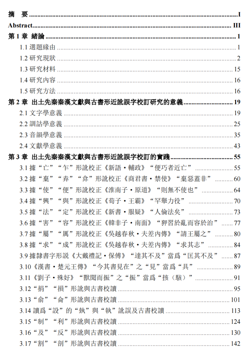 第 2 章主要闡發研究意義。文字學方面,能豐富對文字訛誤現象的認識,爲文字考釋工作提供啟示。訓詁學方面,能爲解決訓詁疑案提供幫助,有助於審慎看待故訓釋義,發現更多問題。音韻學方面,有助於校訂音韻材料,促進音韻學研究。文獻學方面,能爲古書校勘工作提供佐證;有助於合理看待異文及一些文獻現象,如文獻的誤合與改造。