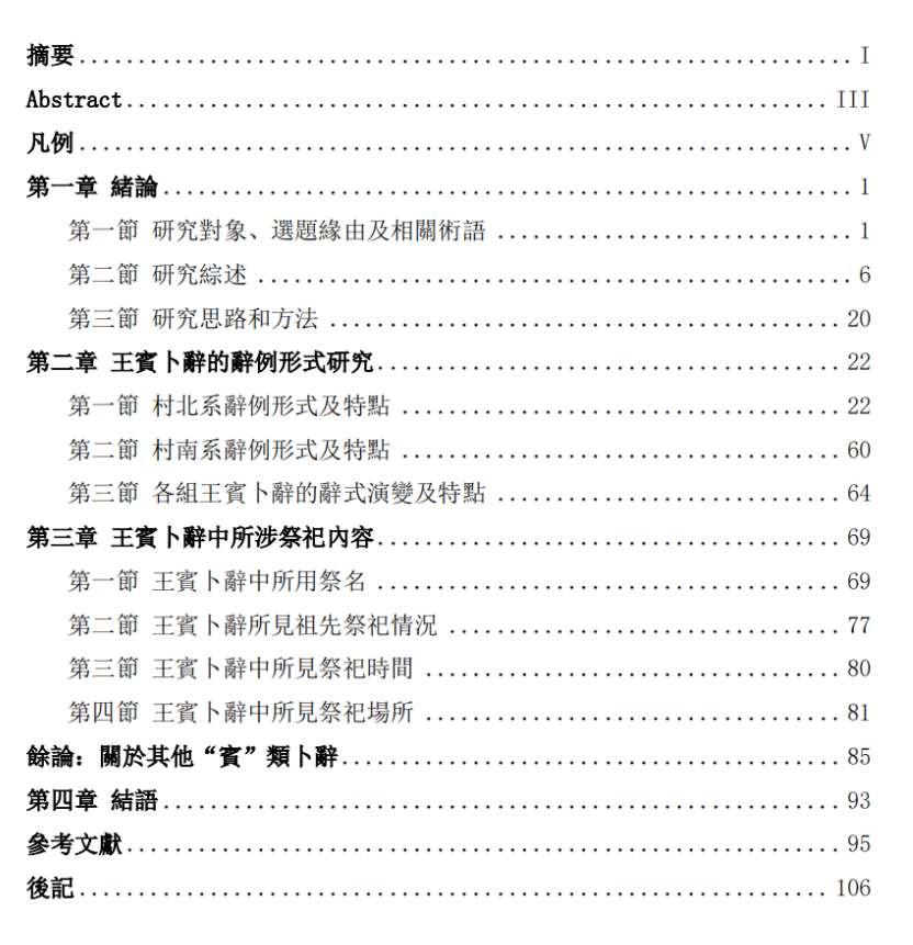 第一章“緒論”。主要介紹本文的研究對象,包括對“王賓卜辭”這一概念的確定、前輩學者已經作出的研究貢獻進行整理以及一些同王賓卜辭辭例形式相關術語的界定。最後對本文的意义、思路和方法作了交代。
