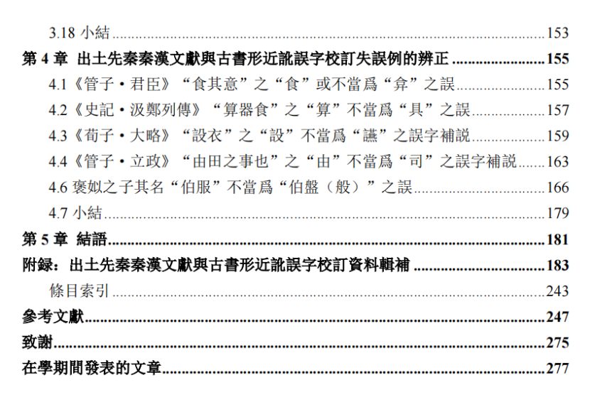 第 4 章主要利用出土先秦秦漢文獻對前人誤判爲形近訛誤字的不當意見進行辨正。這部分提出了 6 則辨正意見,如指出《管子·君臣》“食其意”不當爲“弇其意”之誤、《荀子·大略》“設衣”不當爲“讌衣”之誤、《禮記·樂記》“武王克殷反商”之“反”不當爲“及”之誤、褒姒之子其名“伯服”不當爲“伯盤(般)”之誤。