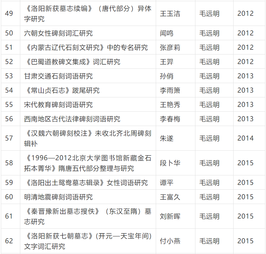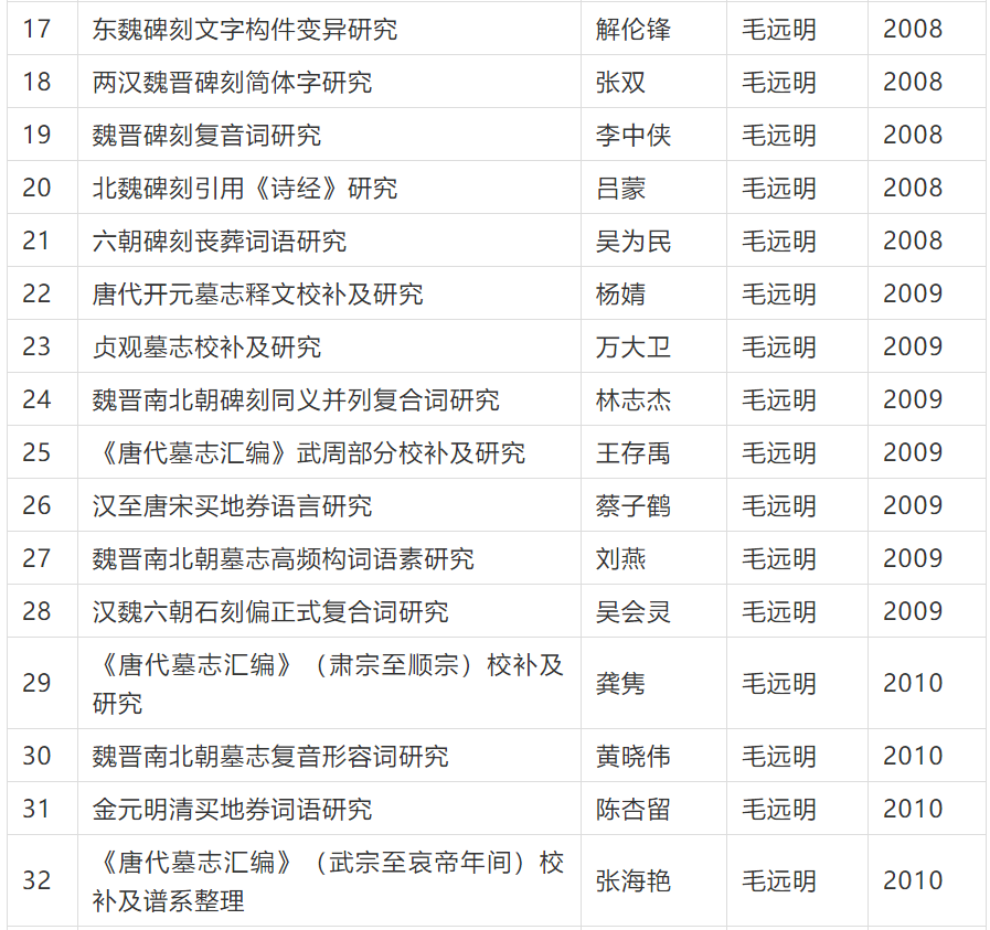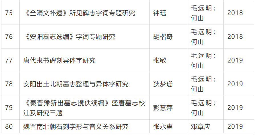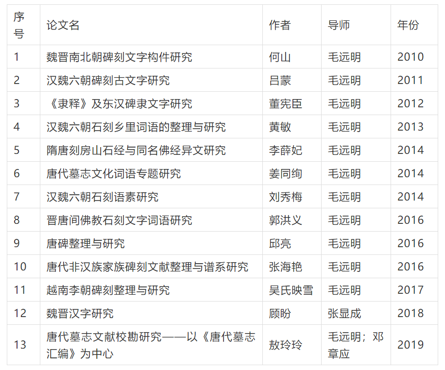 碑刻文献数量庞大,内容广泛,时地自足,真实性强,是研究古代历史、文字、语言、书法、社会、宗教、文化等的宝贵材料。已有研究多集中于历史学、字形学、书法学等方面,而语言文字研究显得比较薄弱,这与碑刻材料的实际研究价值很不相称。近年来,毛远明教授带领数十名硕士、博士研究生,坚持先整理、后研究的思路,围绕碑刻古文字、隶楷书文字,碑刻复音词、典故语、礼俗词、丧葬词等特色词语,开展断代、分域或专书等系列研究,形成多篇质量较高的硕博论文。现将这些论文题目汇总于后,以飨读者。